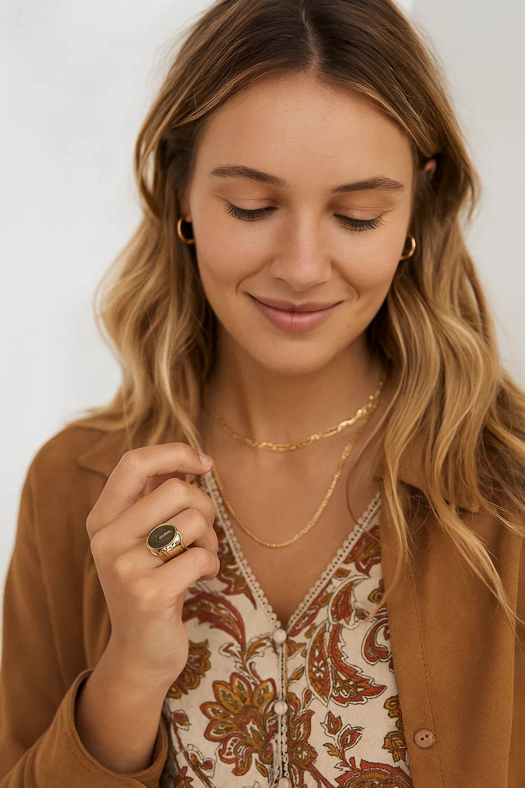 Bague Dorée à Pierre Ovale – Effet Résine Kaki