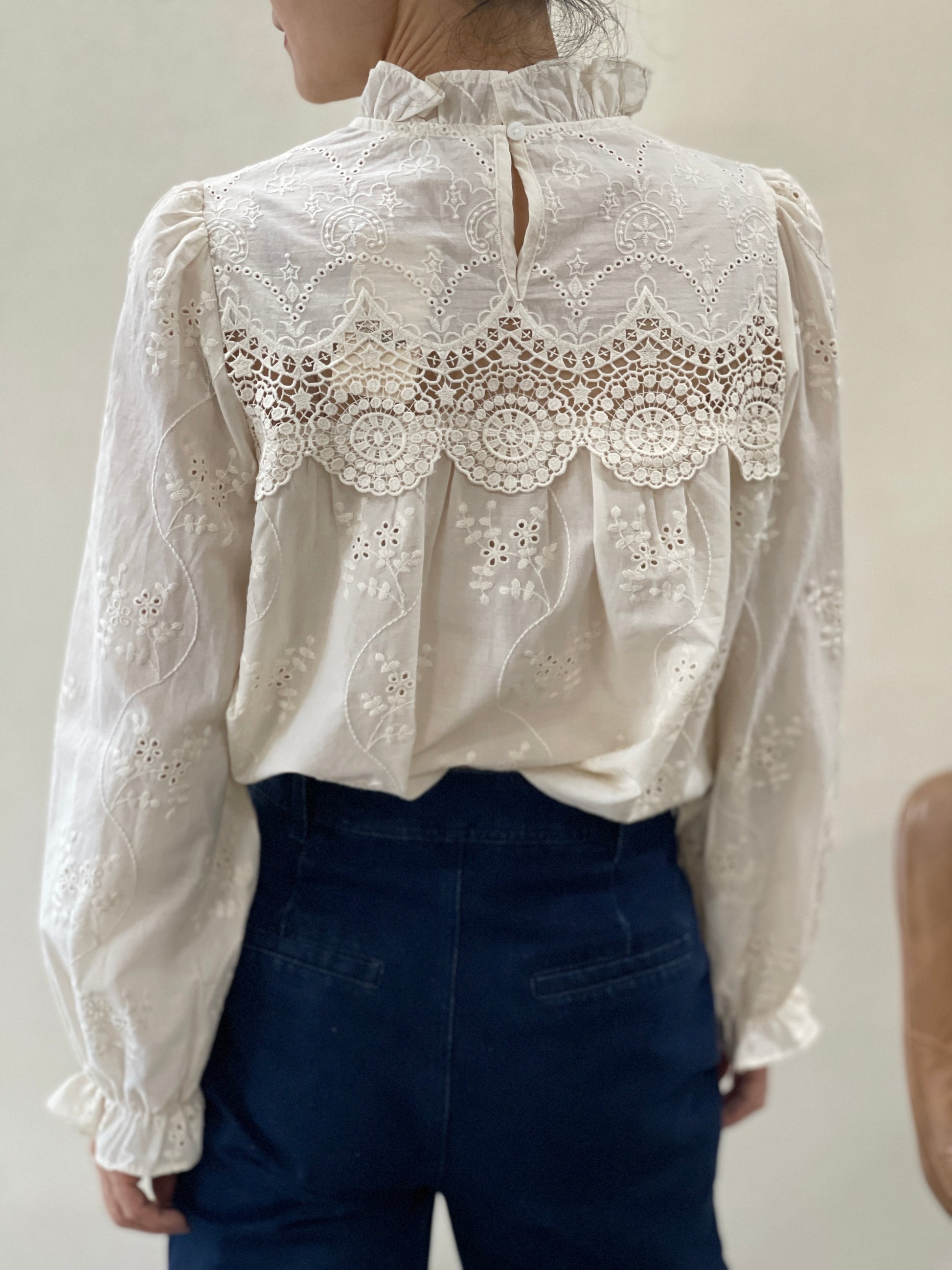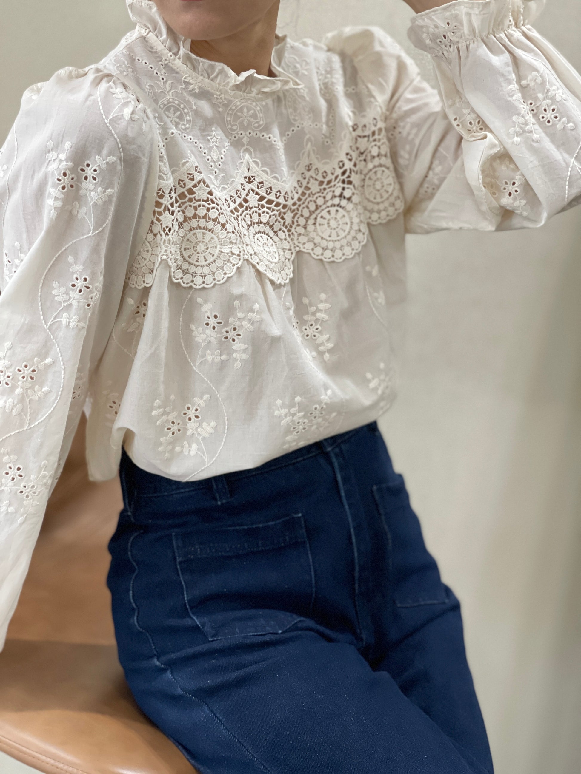 Confectionnée en coton léger, cette blouse séduit par son col volanté romantique, ses manches longues bouffantes resserrées aux poignets et ses broderies anglaises qui apportent texture et élégance. La bande de dentelle travaillée en contraste renforce son allure bohème chic, idéale pour sublimer une silhouette sans effort.