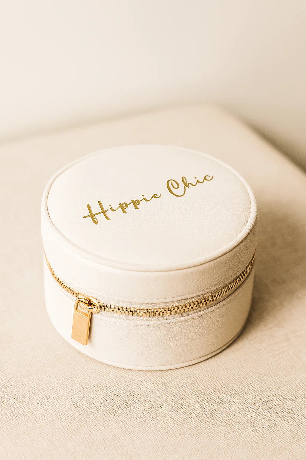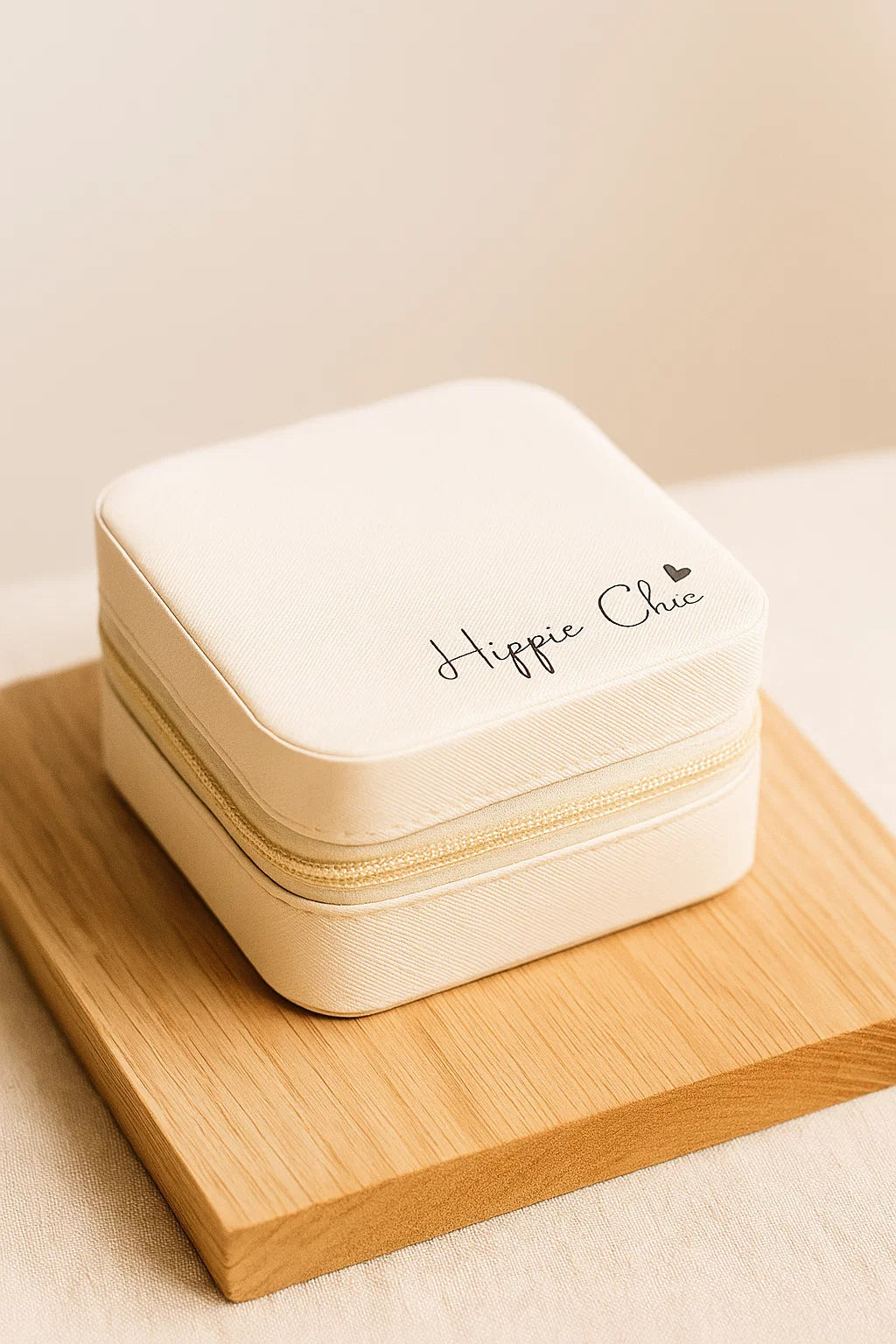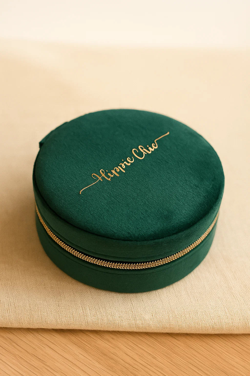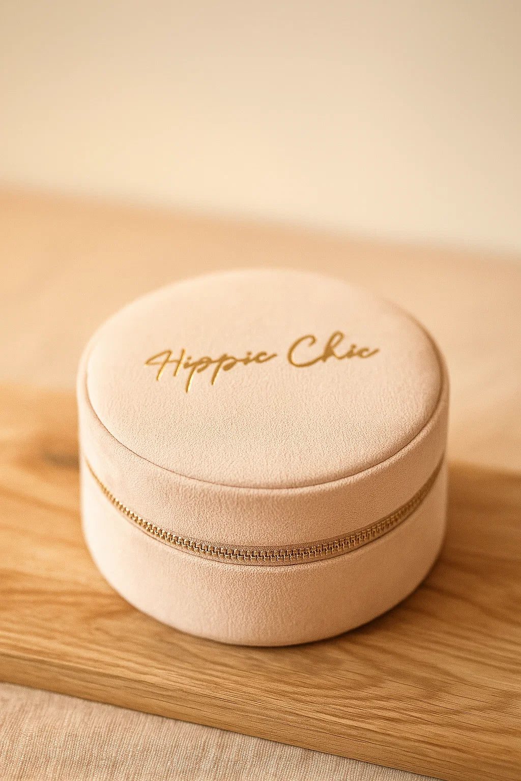 Cette boîte à bijoux signée Hippie Chic allie élégance et fonctionnalité. Déclinée en deux finitions — velours doux ou matière lisse satinée — elle offre un toucher raffiné et un design sobre, rehaussé d’une inscription dorée “Hippie Chic” sur le dessus. Compacte mais astucieuse, elle est parfaite pour ranger tes bijoux préférés ou les emporter lors de tes déplacements.