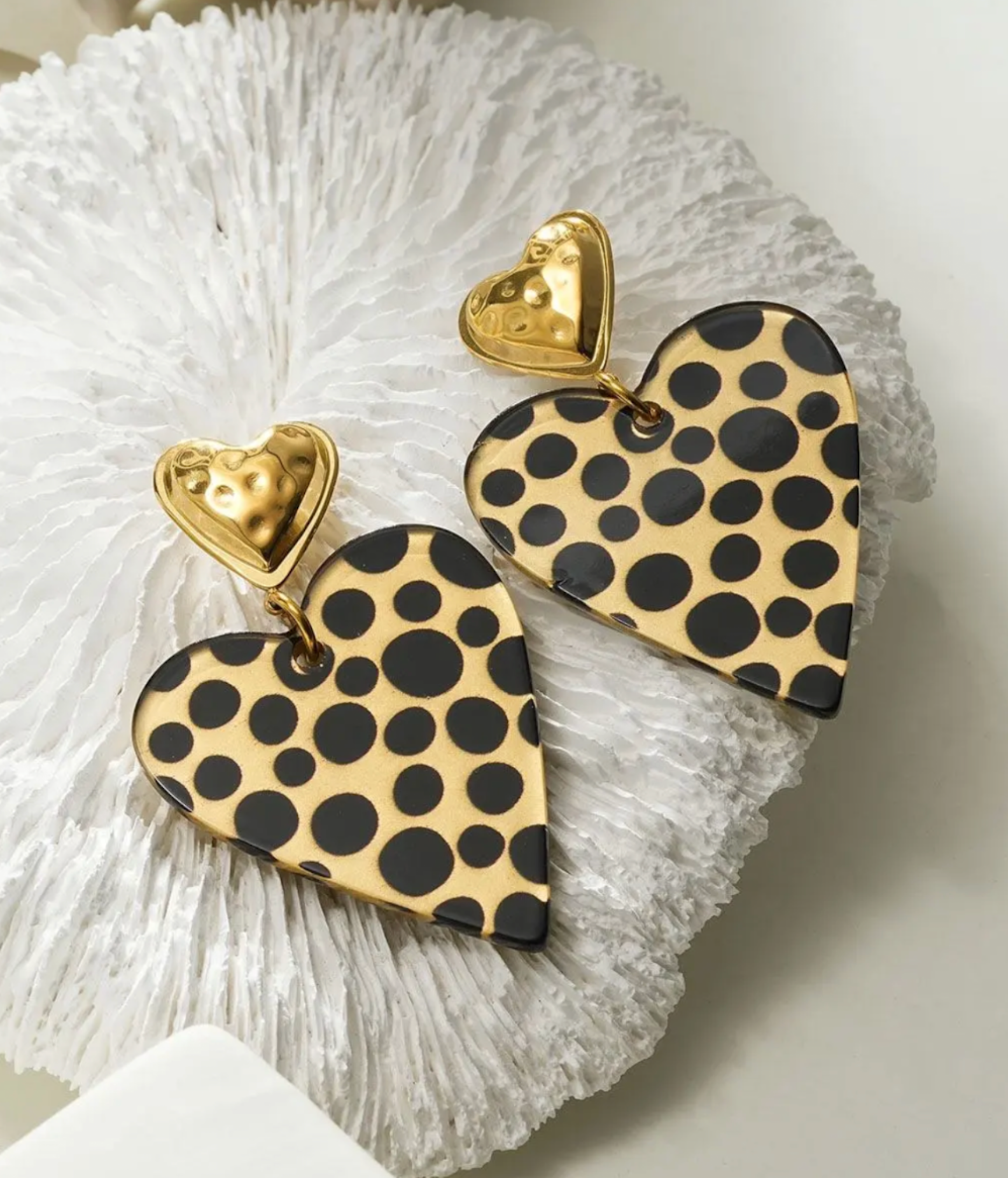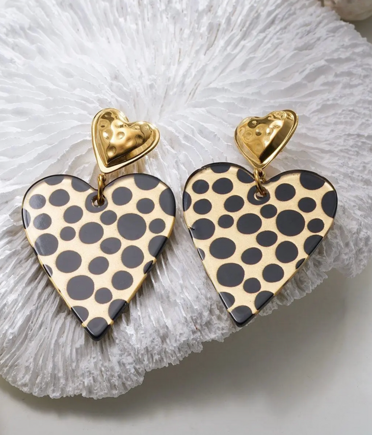 Affirmez votre style avec ces boucles d’oreilles pendantes en forme de cœur, décorées d’un motif à pois noirs sur fond doré. L’attache dorée, également en forme de cœur et légèrement martelée, ajoute une texture précieuse et un clin d’œil romantique chic.