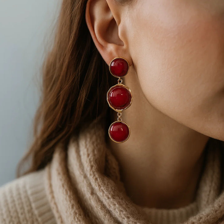 Mesdames, si vous aimez les bijoux qui allongent le port de tête et habillent un look en un clin d’œil, cette paire deviendra un vrai essentiel. Les trois pastilles de résine créent un mouvement subtil, très chic, qui accroche la lumière à chaque geste.