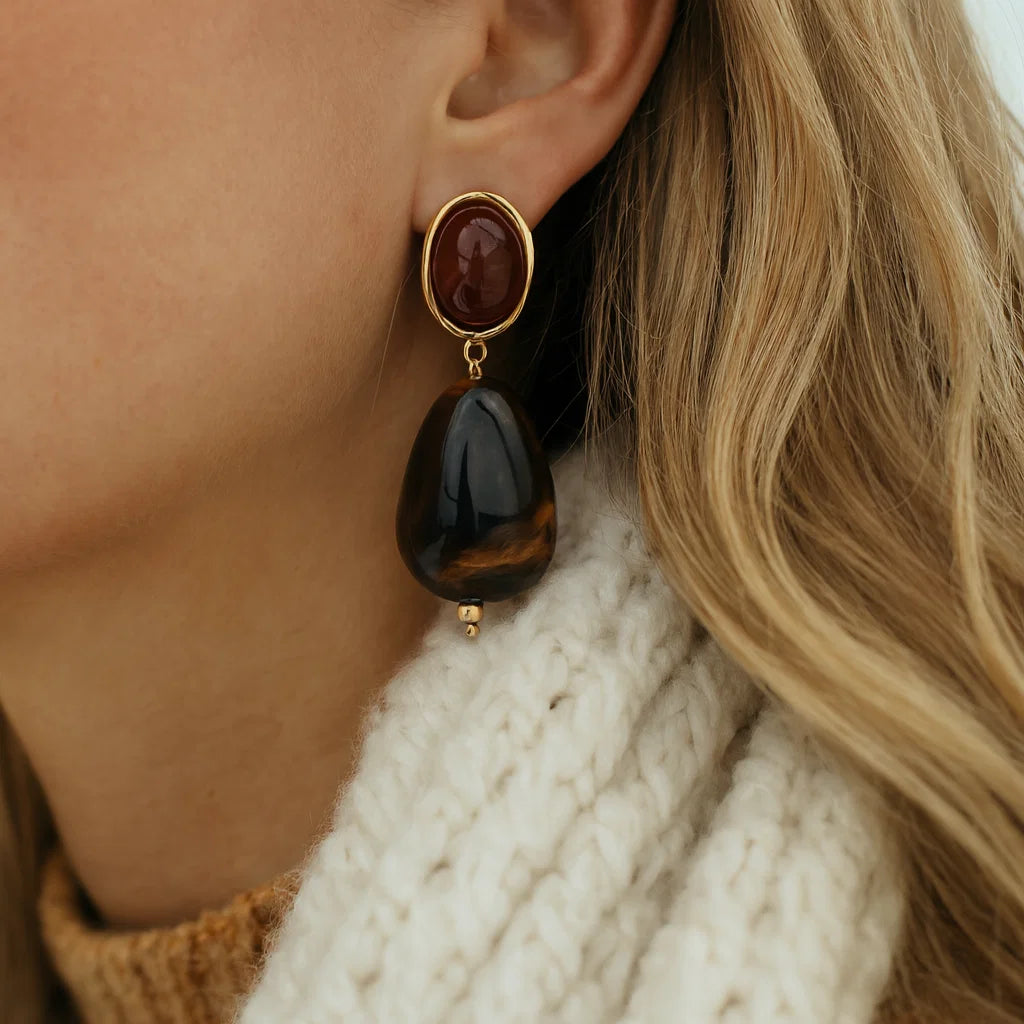 Ces boucles d’oreilles longues associent une résine lumineuse (beige nacré ou marron profond) à un cerclage doré fin en acier inoxydable. Le rendu est à la fois délicat, moderne et très féminin.