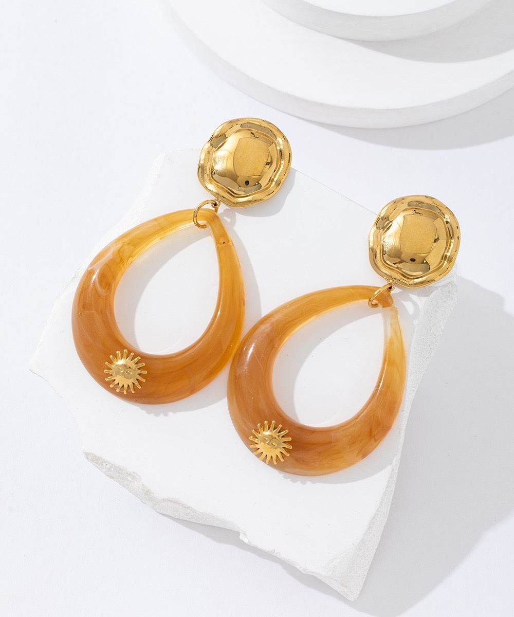 Apportez chaleur et éclat à vos tenues avec ces boucles d’oreilles pendantes en résine ambrée, sublimées par un détail doré en forme de soleil. À la fois élégantes et audacieuses, elles s’imposent comme un bijou statement parfait pour compléter un look bohème chic.