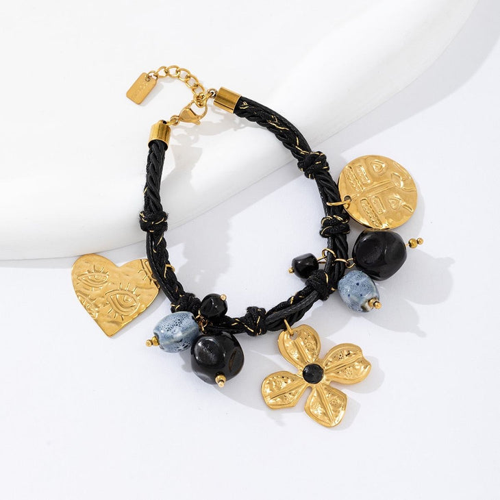 Le cordon épais tressé sert de base à des pendentifs dorés originaux : cœur martelé aux motifs gravés, médaille ethnique, fleur et perles irrégulières aux reflets naturels. Chaque détail fait de ce bracelet une pièce audacieuse qui allie charme bohème et sophistication contemporaine.