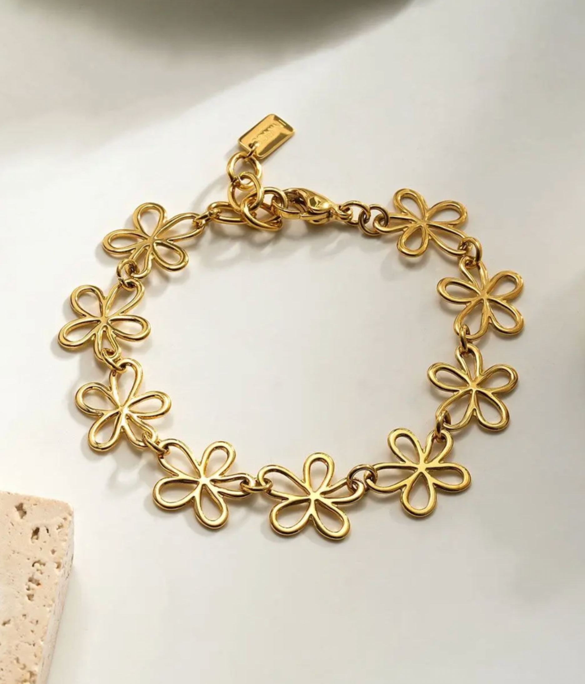 Ce bracelet en acier inoxydable doré séduit par la simplicité de son motif floral ajouré. Chaque fleur stylisée est finement découpée pour créer un bijou à la fois léger, féminin et lumineux. Ce modèle évoque la douceur du printemps et l’esprit bohème chic, tout en restant intemporel.