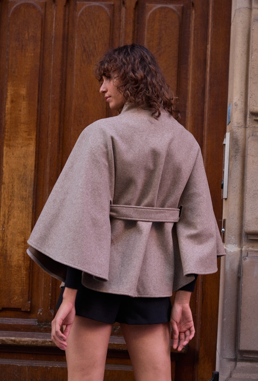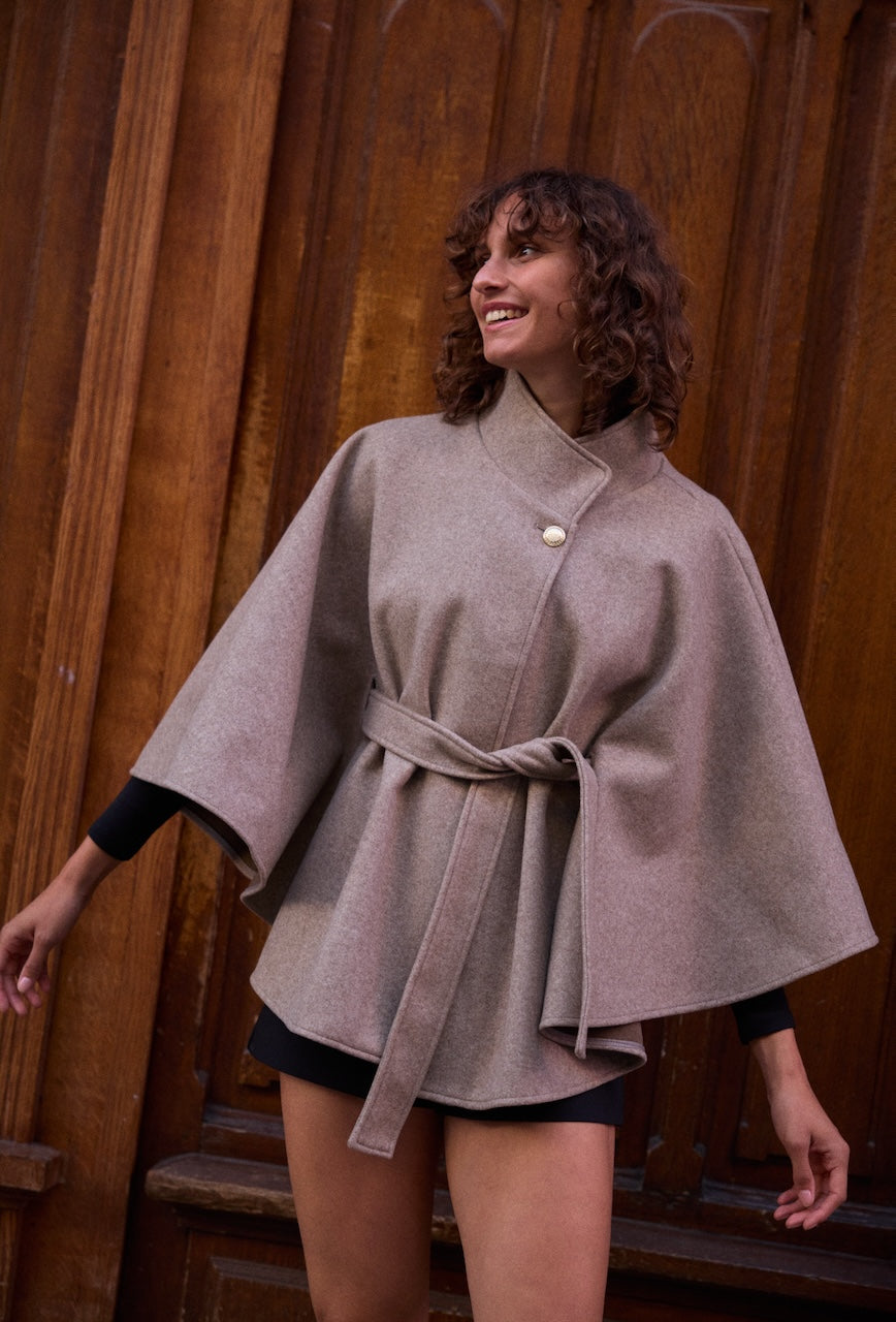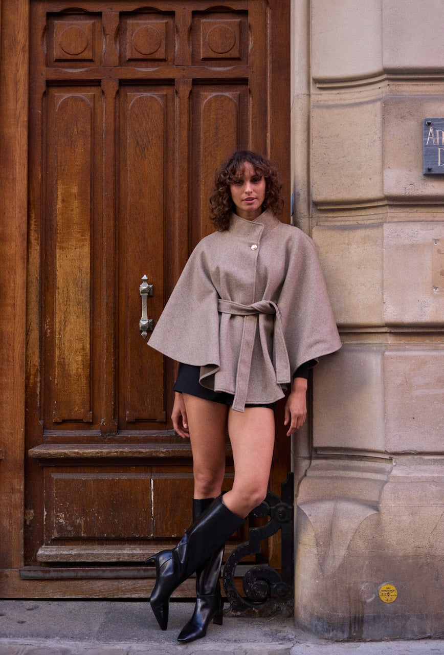 Cette cape se distingue par son col montant fermé par un bouton doré et sa coupe évasée qui apporte structure et raffinement. Sa longueur mi-cuisse permet de la porter aussi bien en journée pour un look casual chic que le soir sur une robe ou une tenue habillée.