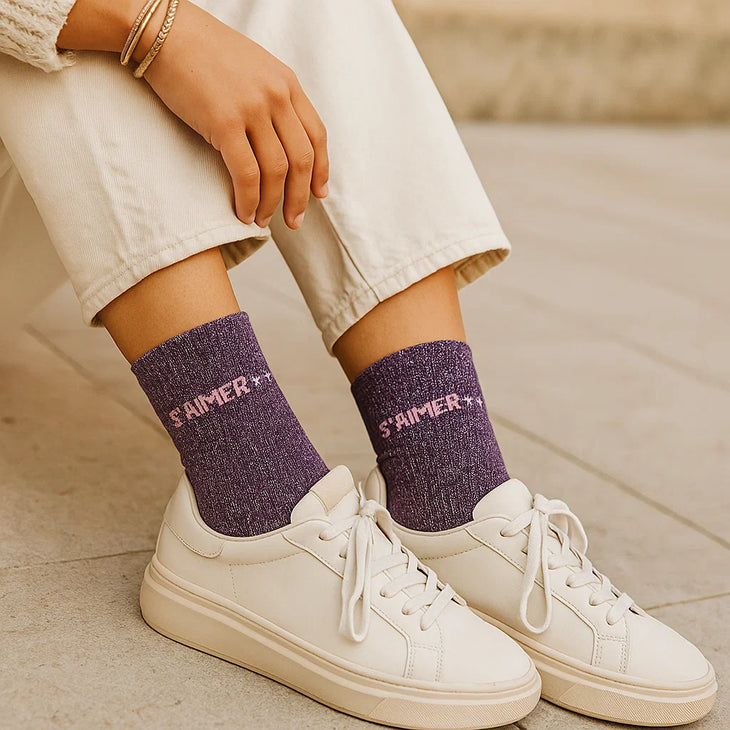 Chaque paire porte le joli mot “S’AIMER”, comme un rappel quotidien d’amour et de bienveillance. Déclinées en plusieurs coloris — prune, rouge, rose, vert, noir brillant… — elles s’accordent facilement avec vos looks d’hiver ou vos moments cocooning. Leur maille légèrement pailletée apporte une touche chic et féminine, parfaite pour se sentir jolie même dans les petits détails.