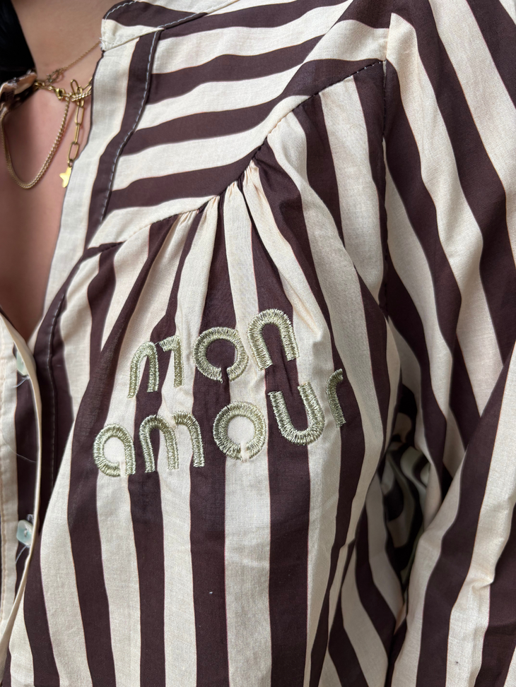 Elle se distingue par son imprimé à rayures marron et beige, son col en V avec patte boutonnée et ses manches longues légèrement bouffantes resserrées aux poignets. La broderie discrète "mon amour" apporte une touche romantique et féminine.
