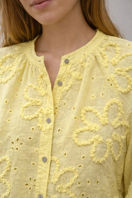 Son charme réside dans ses broderies en relief et ses détails ajourés délicats qui apportent du caractère sans alourdir la tenue. Les manches longues légèrement bouffantes renforcent son esprit bohème chic, tandis que le boutonnage discret sur le devant permet de l’ajuster selon vos envies.