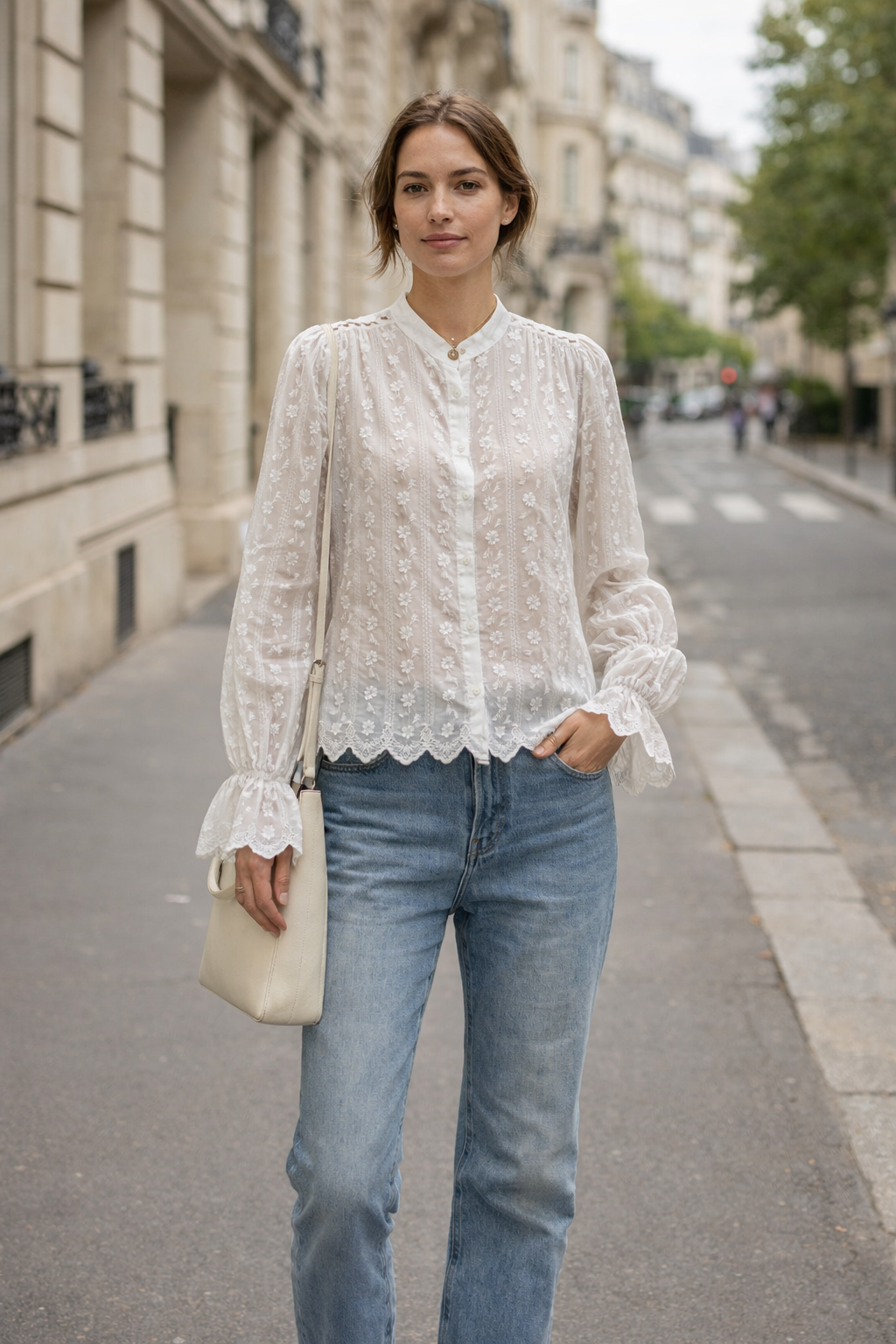 Cette chemise dévoile une sublime broderie anglaise sur toute la surface, offrant un jeu de transparence délicat tout en restant élégante. Les manches légèrement bouffantes, resserrées par un poignet volanté, apportent du charme et du mouvement.