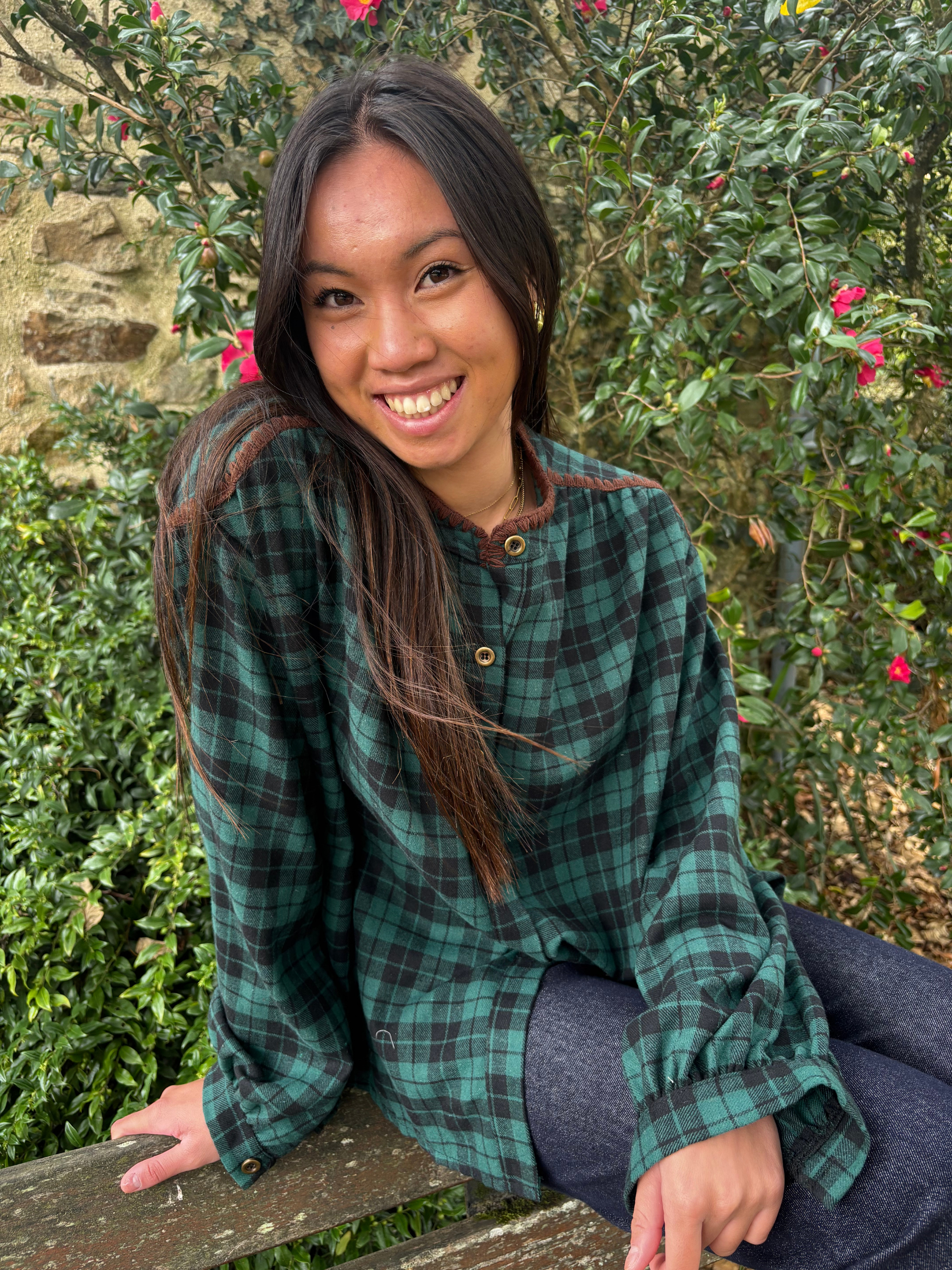 Elle se distingue par son imprimé à carreaux verts et noirs, sa patte boutonnée sur le devant et ses manches longues resserrées aux poignets. Les finitions contrastées au col et aux épaules ajoutent une touche originale et raffinée.