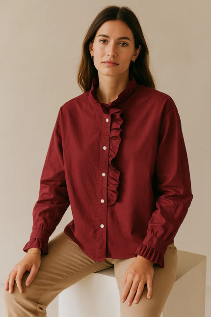 Les volants subtilement placés le long de la patte de boutonnage et aux poignets donnent du caractère à la chemise sans jamais en faire trop. Le col légèrement froncé met en valeur le port de tête et apporte ce petit supplément chic que l’on adore chez Hippie Chic. En coton, la chemise reste douce, respirante et idéale au fil des saisons.