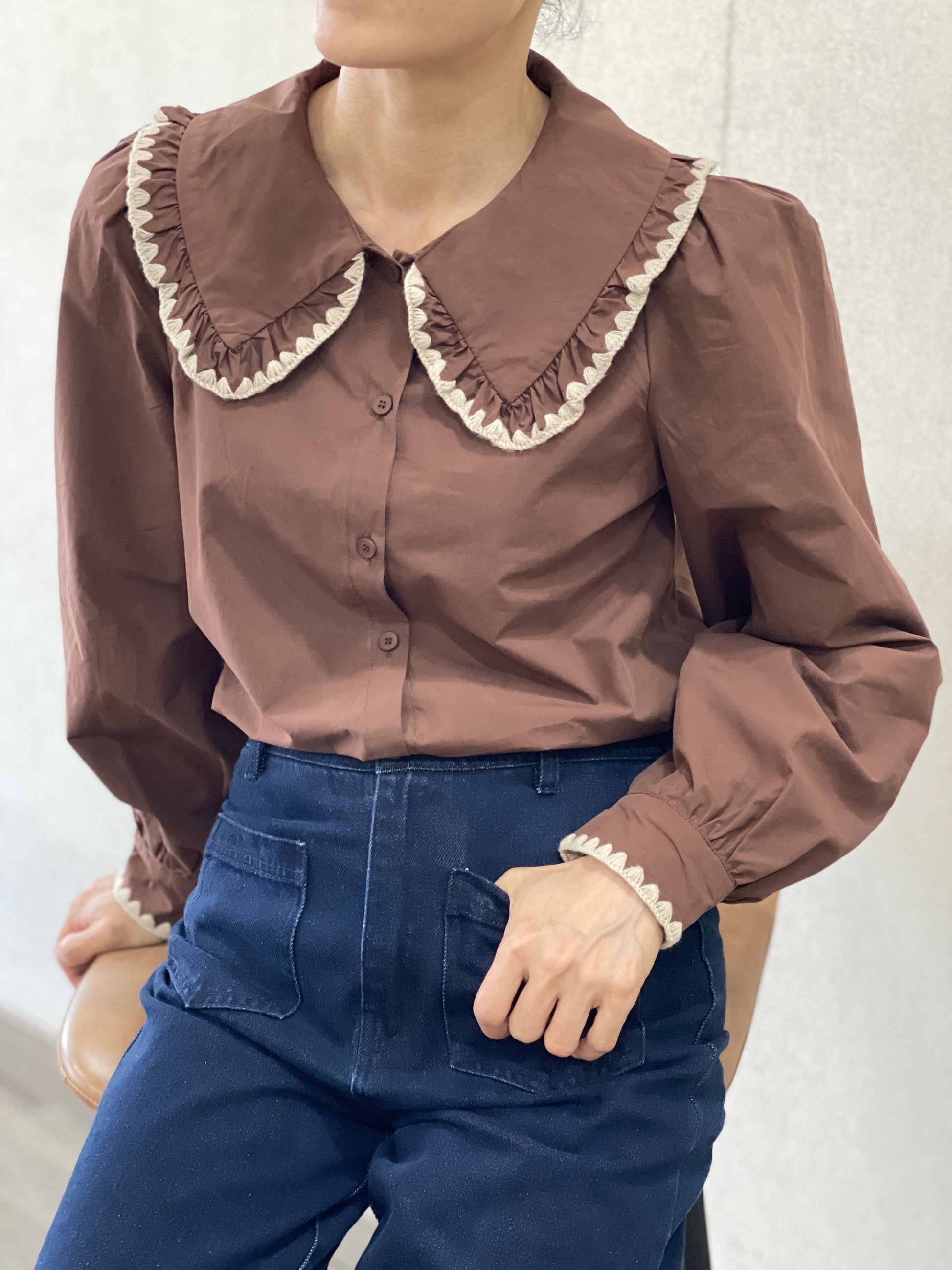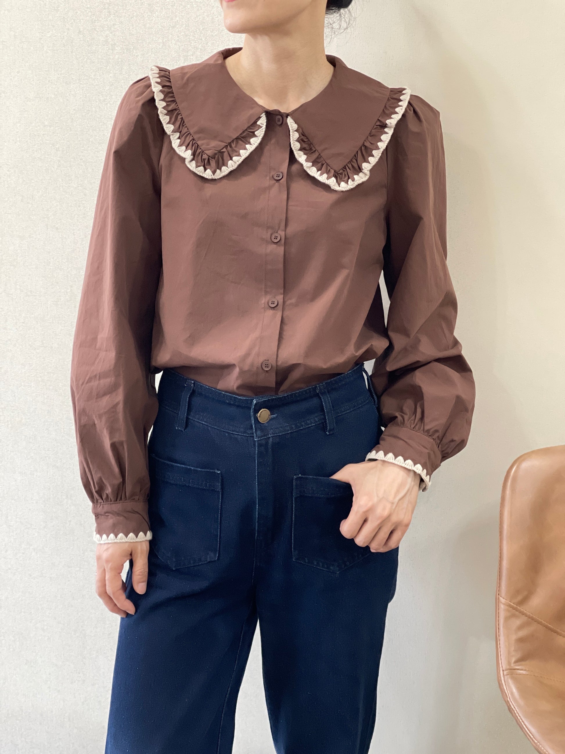 Sa particularité réside dans son grand col oversize orné de volants et d’une délicate bordure contrastée écrue, qui apporte une touche romantique et sophistiquée. Les manches longues légèrement bouffantes se terminent par des poignets décorés des mêmes finitions, renforçant le charme unique de cette blouse. Confectionnée en coton, elle est agréable à porter tout au long de la journée.