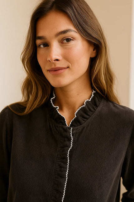Cette chemise en coton volantée allie douceur, légèreté et raffinement. Sa coupe fluide et agréable à porter en fait une pièce essentielle du dressing féminin. Le col montant orné de volants et la patte de boutonnage délicatement froncée apportent une touche romantique et élégante, tandis que sa matière en 100 % coton garantit confort et respirabilité au quotidien.