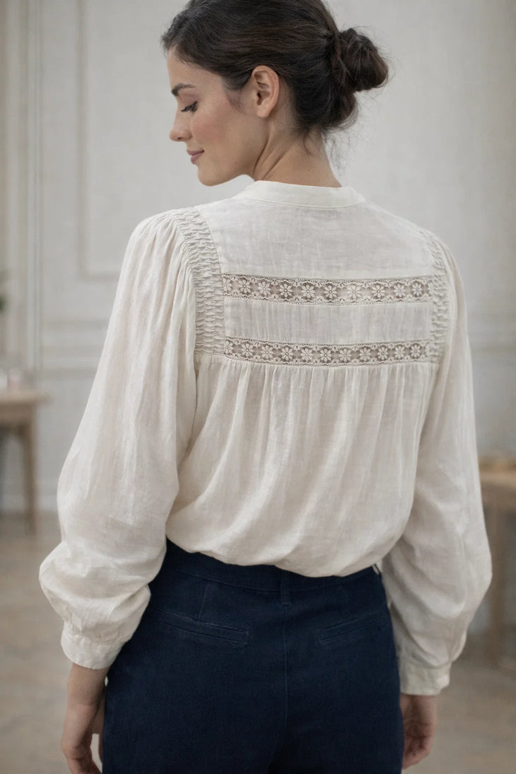 Les détails en dentelle florale délicatement intégrés à l’avant et dans le dos apportent une touche romantique et travaillée, tout en restant sobres. Le col légèrement ouvert et les boutons discrets soulignent le charme naturel de cette chemise, idéale pour le quotidien comme pour des occasions plus habillées.