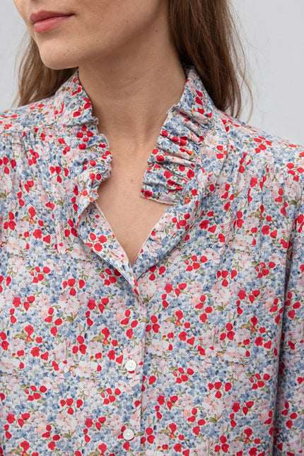 Cette chemise en 100 % coton du S au L séduit par son imprimé liberty aux nuances rouges, bleues et beiges. Son col montant délicatement travaillé et son lien lavallière apportent une touche sophistiquée et féminine à la silhouette.