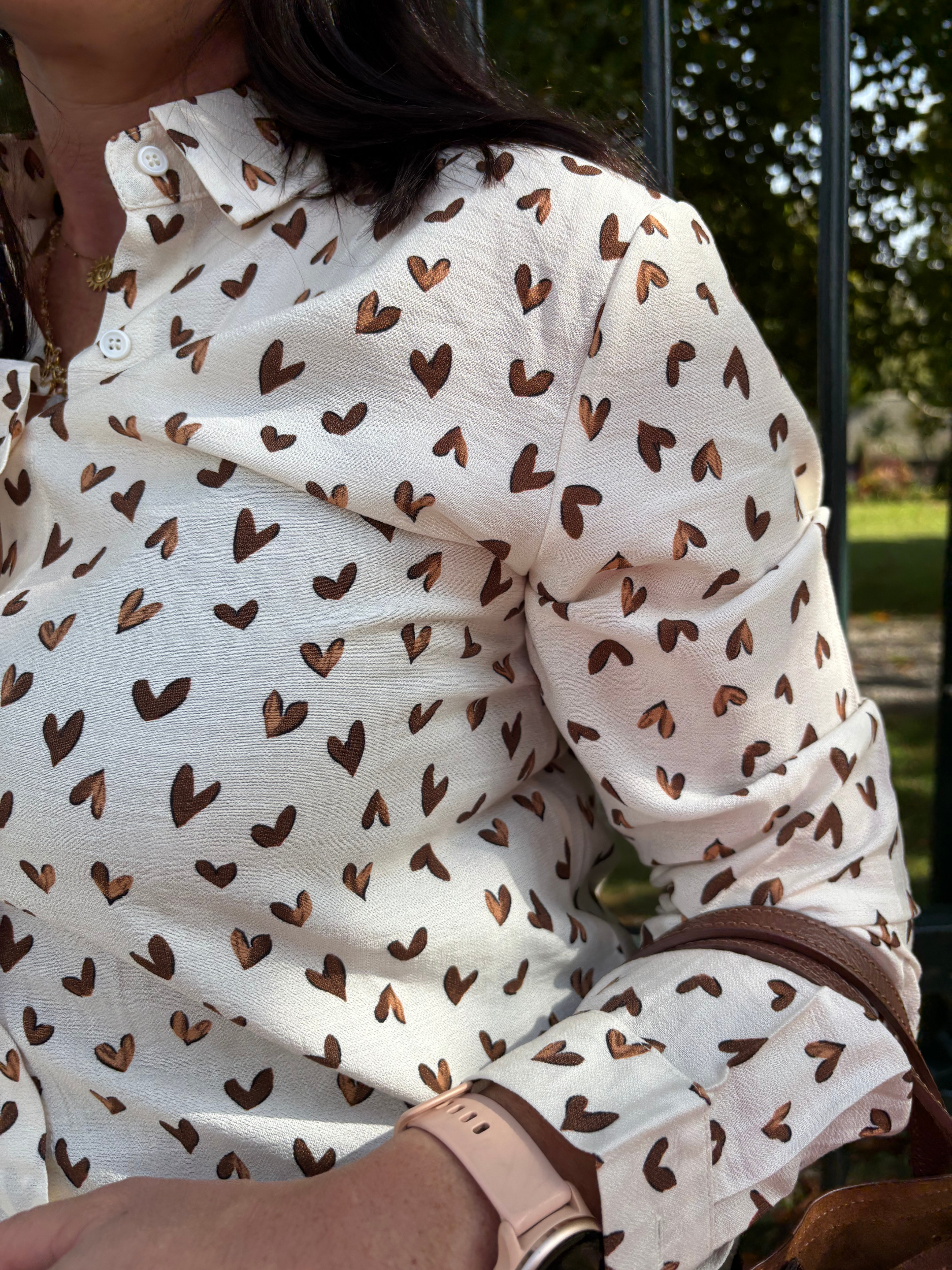 Apportez une touche romantique et tendance à vos tenues avec cette chemise blanche à imprimé cœurs. Légère et fluide, elle séduit par son design fantaisie et sa coupe confortable. Avec ses petits cœurs marron imprimés sur fond clair, elle est idéale pour apporter douceur et originalité à votre look.