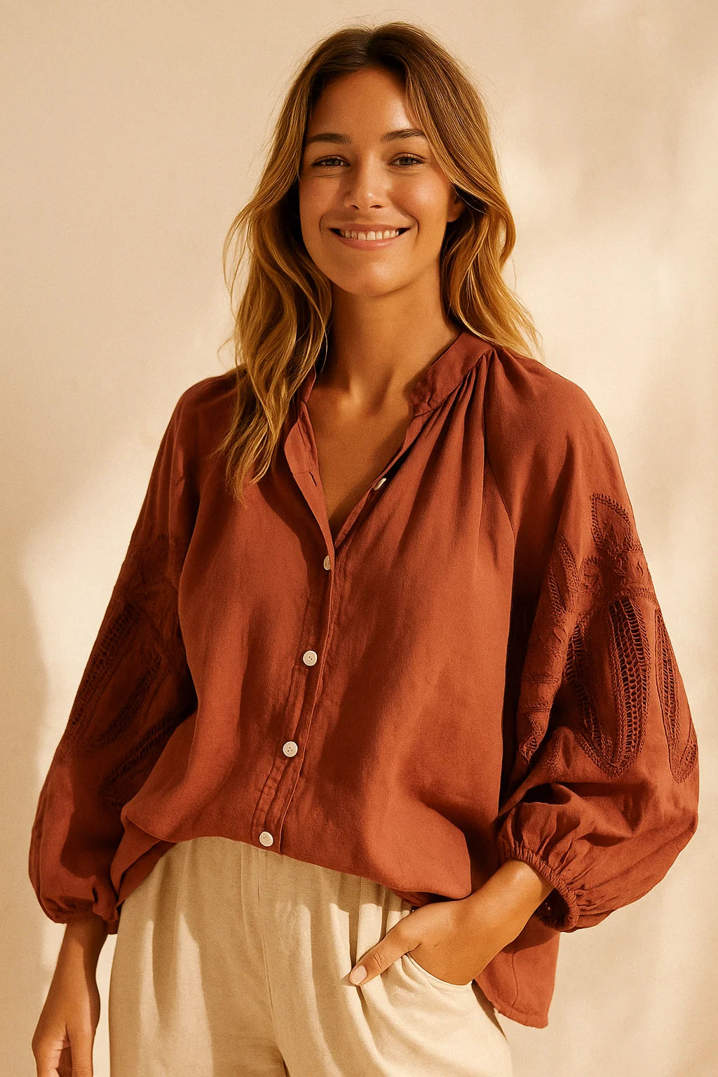 Adoptez un style chic et naturel avec cette chemise en coton à la coupe ample et féminine. On aime ses manches longues bouffantes brodées, ornées de motifs floraux ajourés qui apportent une touche de légèreté et d’élégance. Sa matière 100 % coton assure un confort optimal tout au long de la journée.