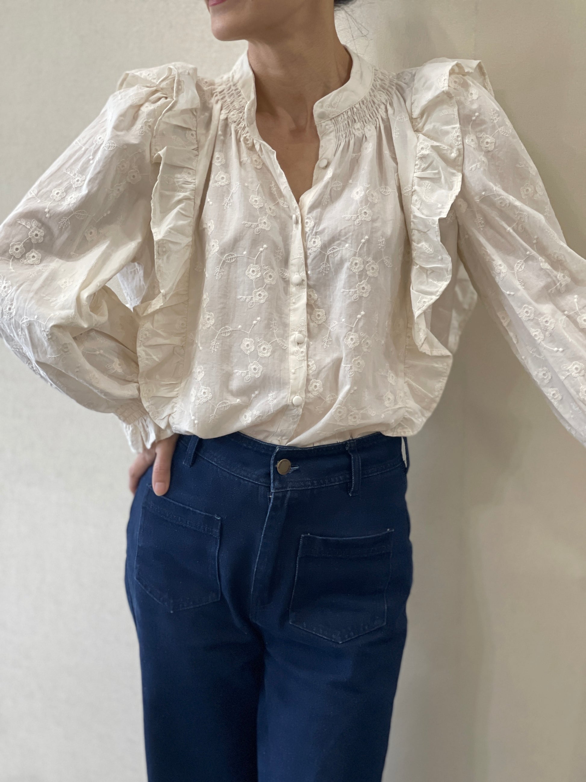 Conçue dans un coton léger et respirant, cette blouse se distingue par ses broderies florales délicates et ses volants appliqués sur le devant et les épaules, qui ajoutent du mouvement et du charme. Le col montant smocké et les poignets élastiqués volantés renforcent son allure romantique. Sa coupe légèrement ample en fait une pièce confortable et facile à porter.