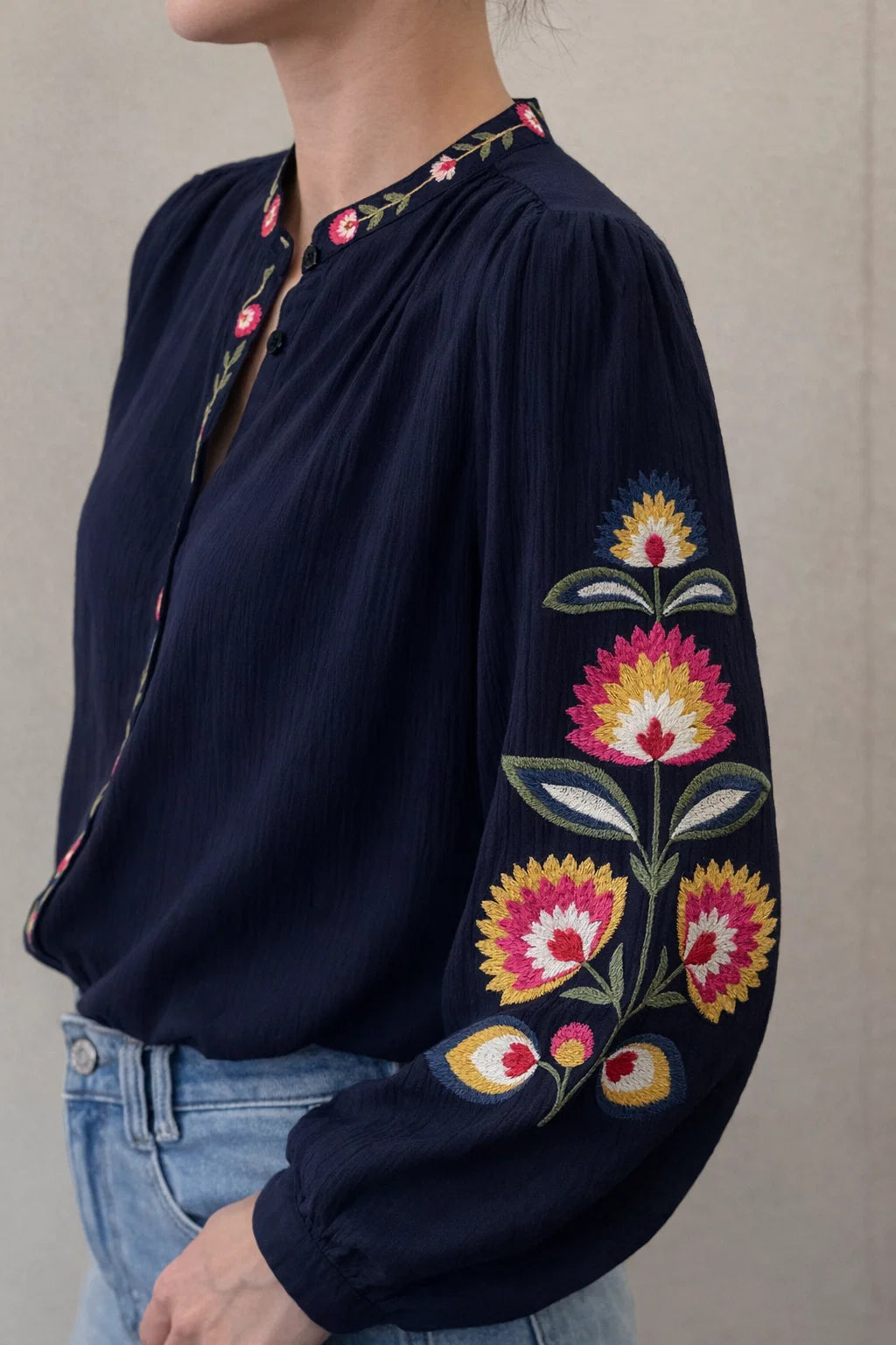 Cette chemise marine brodée est une pièce forte, à la fois élégante et originale. Son bleu profond met en valeur les broderies florales colorées placées sur les manches et le long de la patte de boutonnage. Les détails sont travaillés avec soin pour apporter une touche bohème chic tout en restant facile à porter au quotidien.