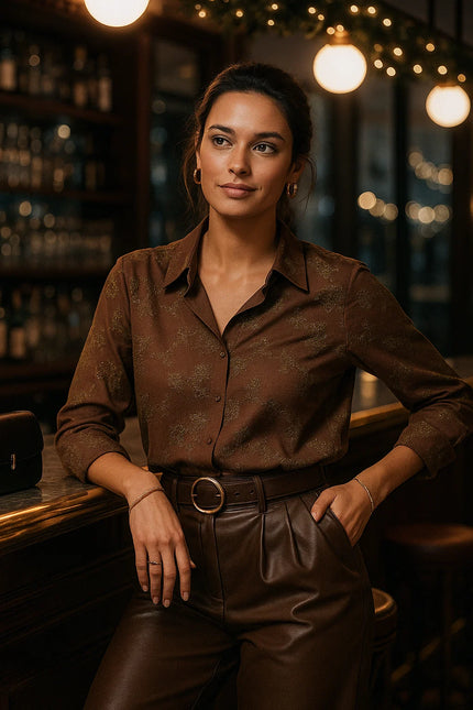 Chemise marron imprimée doré – élégante, fluide et lumineuse