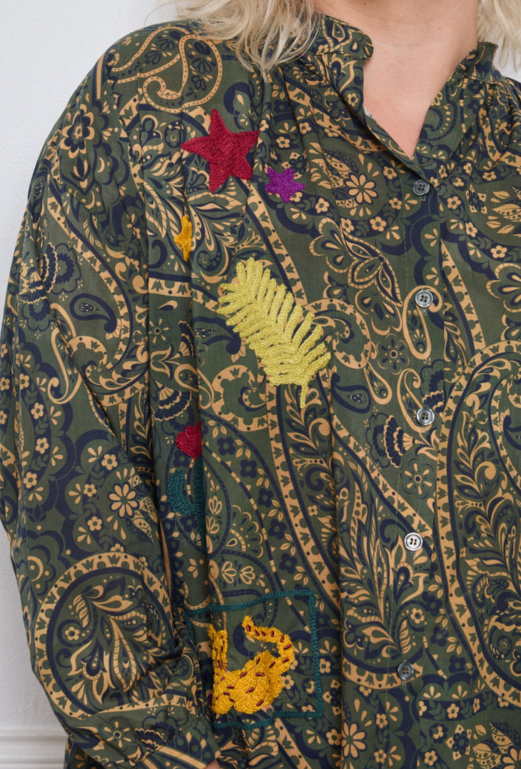 Les manches longues et le col classique apportent une touche d’élégance, tandis que les broderies et imprimés donnent à cette chemise un caractère unique, parfait pour un look bohème chic ou casual.