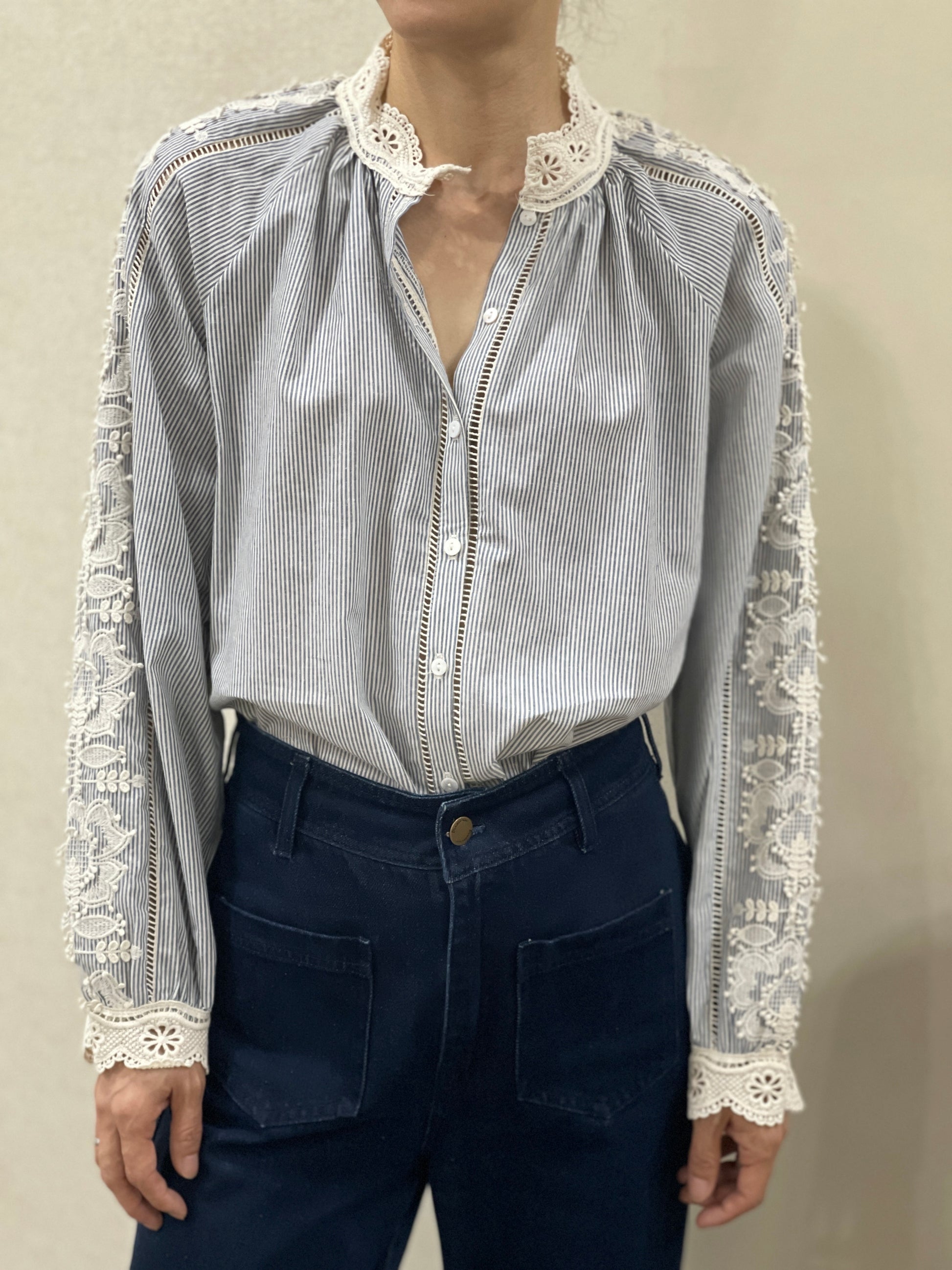 Confectionnée dans un coton doux et respirant, cette blouse se pare de rayures fines bleues et blanches rehaussées de bandes de dentelle blanche délicate le long des manches et aux poignets. Son col volanté bordé de dentelle ainsi que sa patte de boutonnage élégante renforcent son allure féminine et romantique. Les manches longues bouffantes apportent volume et légèreté à la silhouette.