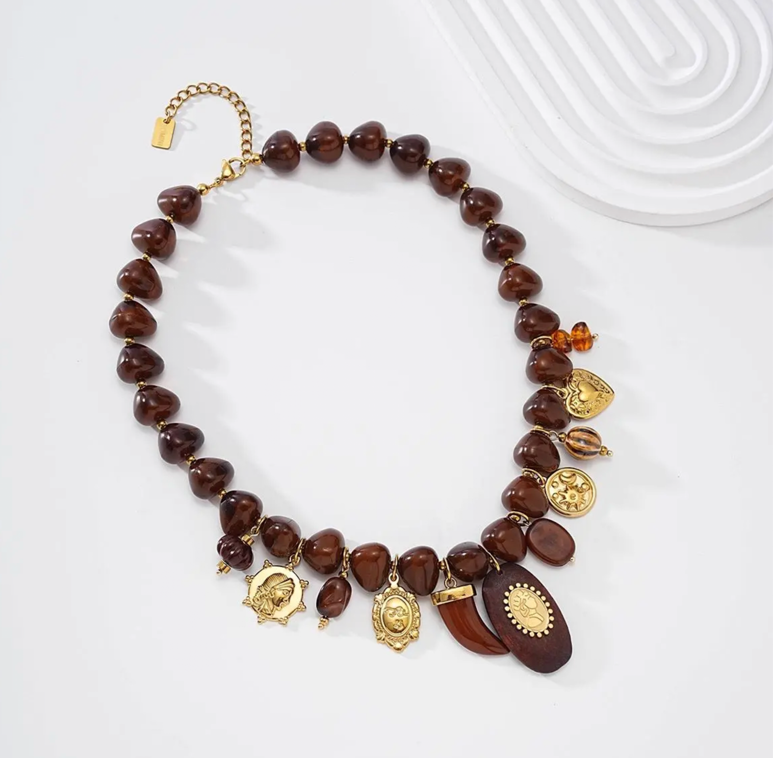 Ce collier brun et doré séduit par son mariage harmonieux entre perles brunes au fini lustré et pendentifs dorés délicatement travaillés. Les breloques symboliques — médaillons gravés, fleurs, cœurs et soleil doré — reflètent la lumière avec subtilité, évoquant la richesse des bijoux artisanaux. L’ensemble crée un bijou fort et raffiné, emblématique du style Hippie Chic.