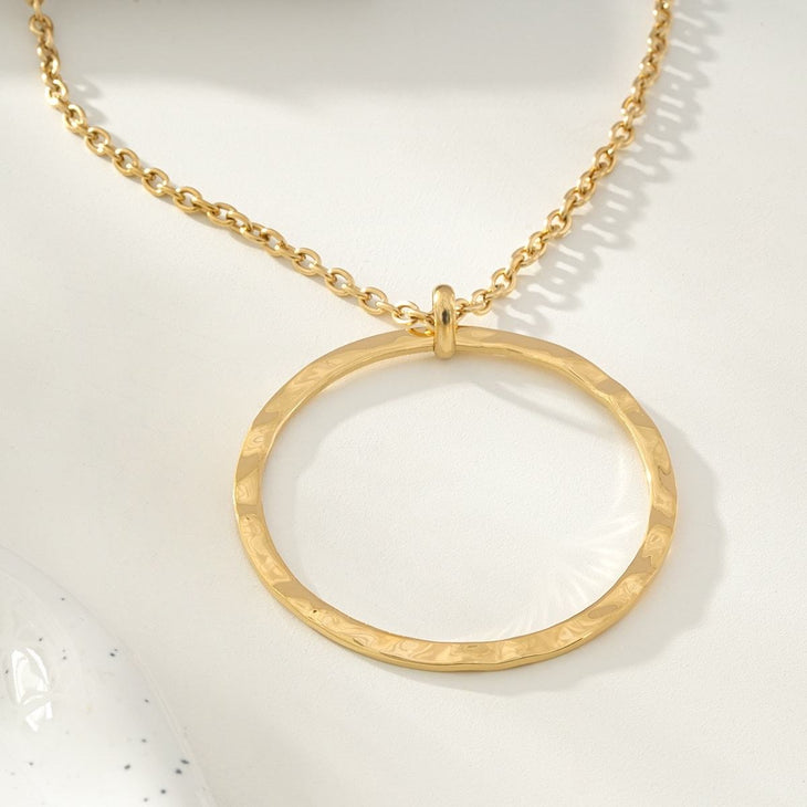 Ce collier se compose d’une chaîne en acier inoxydable à maillons larges, sublimée par un cercle texturé effet martelé.