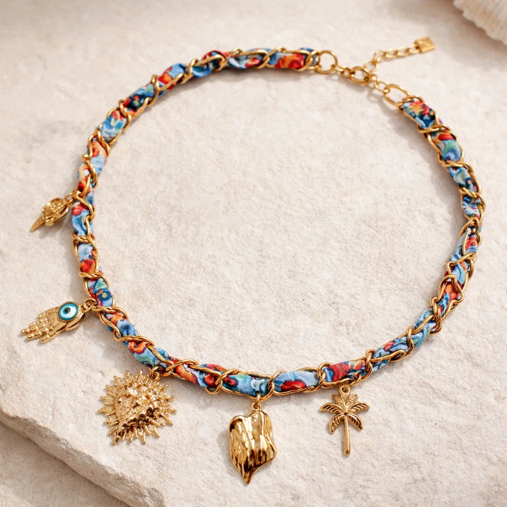 Collier chaîne tissu breloques bohème