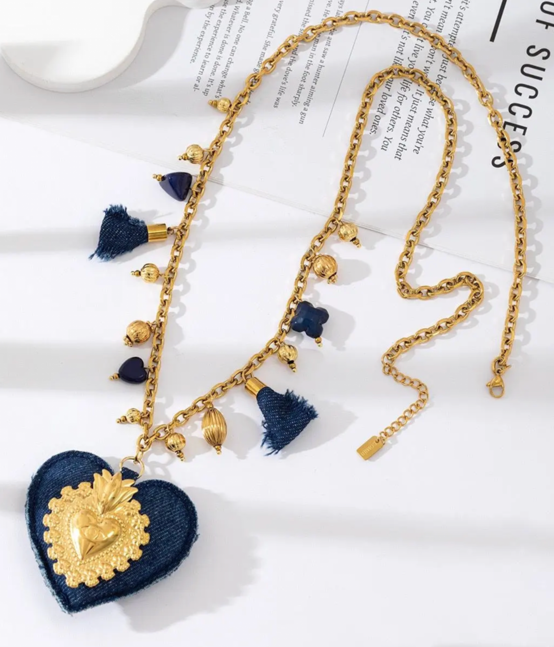 Ce collier doré à pendentif cœur est une vraie pièce de caractère. Il combine un grand cœur en tissu bleu effet denim, orné d’un motif doré travaillé, avec une chaîne décorée de pompons, perles dorées et charms variés. L’ensemble offre un look à la fois bohème, chic et original, qui capte la lumière et attire le regard.