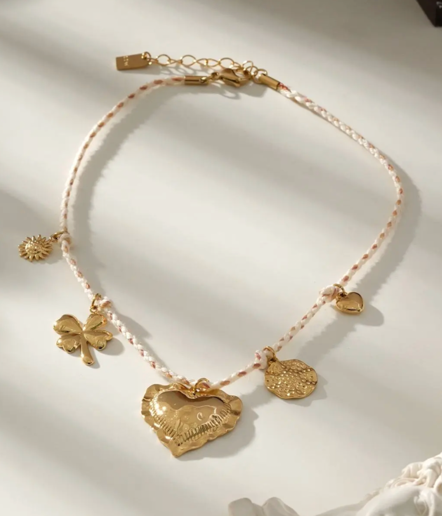 Ce collier à cordon tressé rose pâle et blanc se distingue par ses charms dorés finement choisis : trèfle, soleil, cœur, médaille martelée, et un large médaillon cœur gravé lune et soleil. Une pièce délicate et pleine de sens, inspirée de l’univers mystique et poétique.