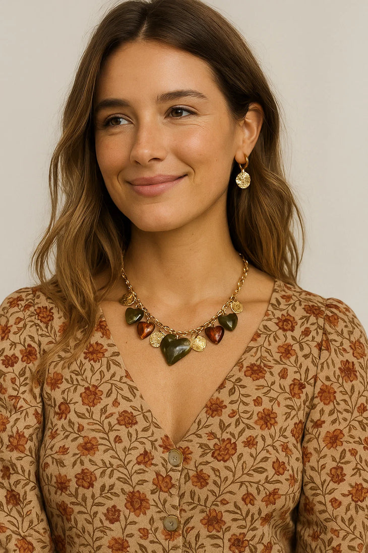 Ce collier doré orné de cœurs en résine colorée et de médaillons martelés est une pièce pleine de charme. Sa chaîne dorée légèrement texturée accueille une succession de breloques alternant entre cœurs brillants — effet pierre dans des tons vert et caramel — et médaillons dorés irréguliers qui attrapent joliment la lumière.