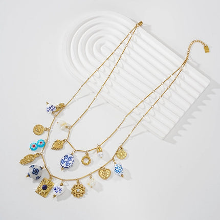 Ce collier double rang se distingue par sa richesse de détails et son accumulation de charms délicats. Entre perles bleues esprit porcelaine, médaillons dorés et petits pendentifs symboliques, il attire immédiatement le regard et apporte une vraie personnalité à votre tenue.