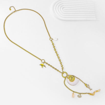 Ce collier séduit par ses détails délicats inspirés de la mer : coquillages, poisson, pampilles et éléments nacrés. Chaque charme apporte une touche de fraîcheur et de légèreté, pour un rendu lumineux et raffiné.