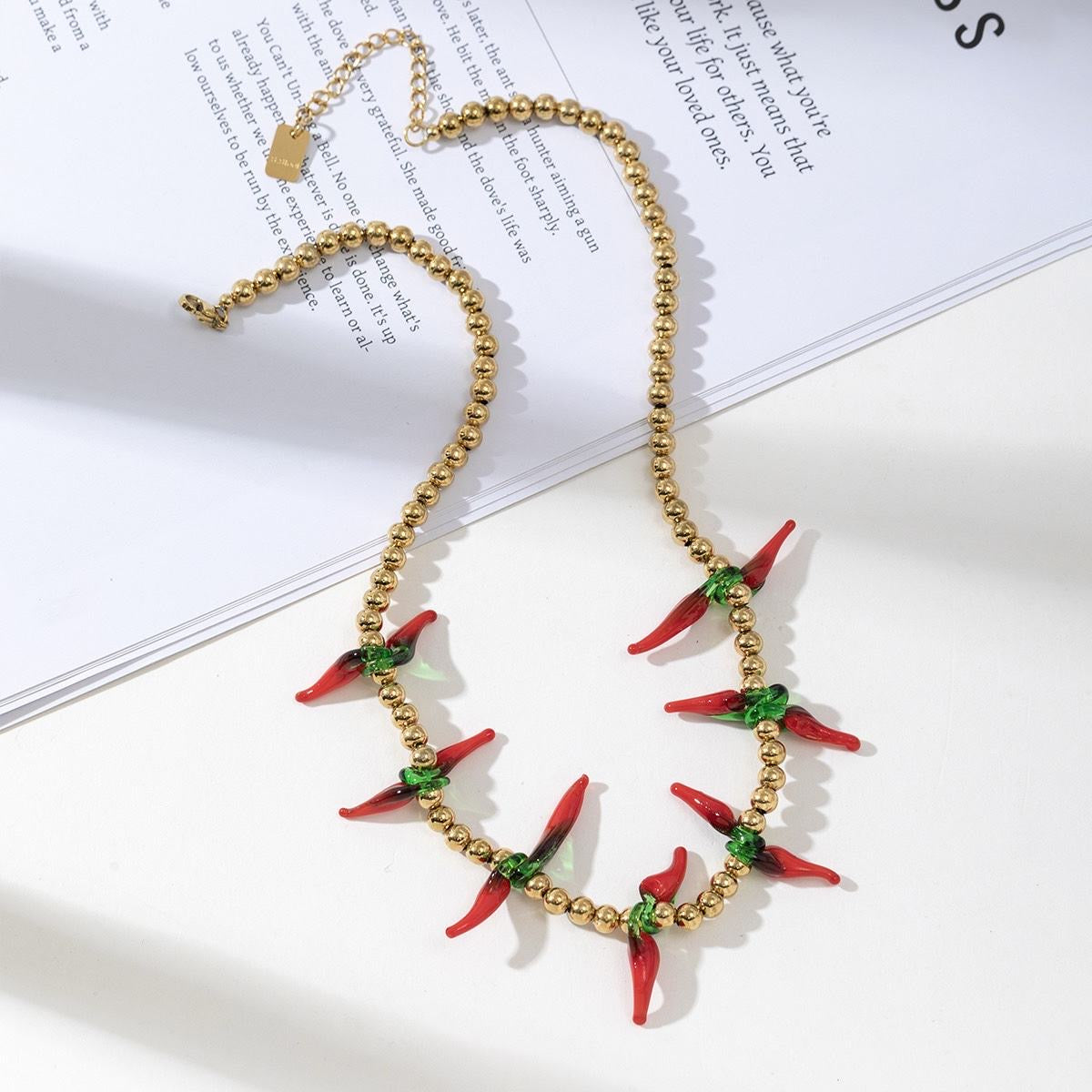 Ce collier atypique et vibrant est composé de petites perles dorées sur lesquelles sont suspendus de véritables petits piments en verre soufflé rouge et vert.