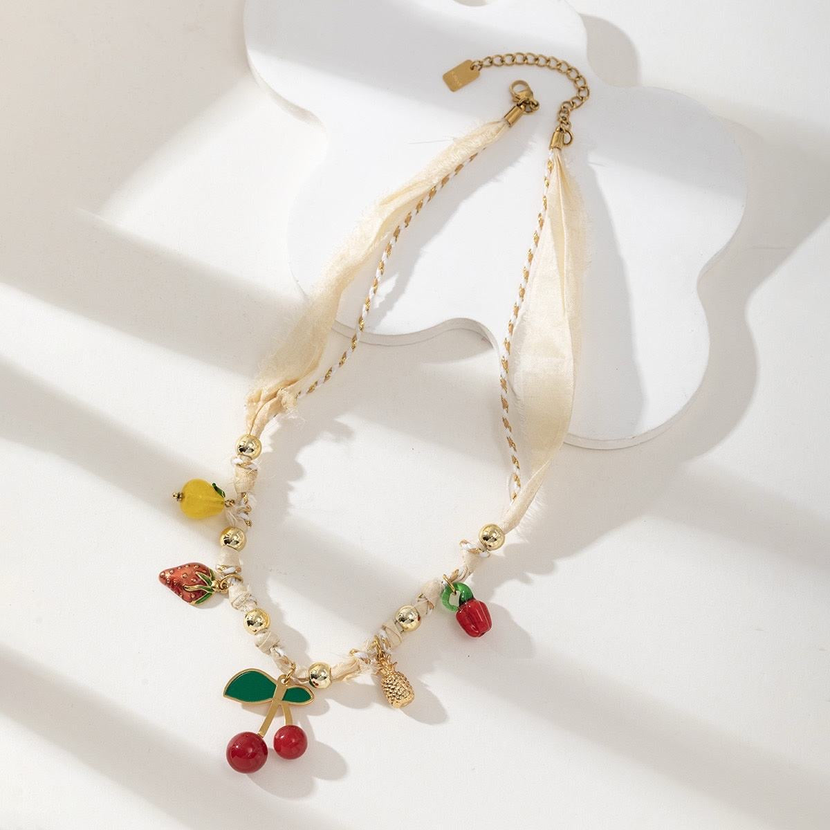 Ce collier se distingue par son design original alliant une cordelette tressée beige, des perles dorées, un ruban en tissu légèrement irisé, et une série de pendentifs fruités : cerise, fraise, citron, ananas, et poivron rouge.