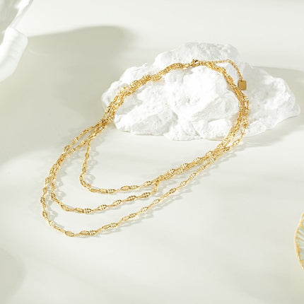 Chères clientes, ce collier doré multi-rangs en acier inoxydable est une pièce intemporelle et féminine, parfaite pour illuminer vos tenues avec élégance. Ses trois chaînes torsadées, fines et délicatement scintillantes, apportent un jeu de lumière raffiné qui met instantanément en valeur votre décolleté.