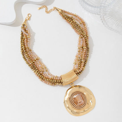 Ce collier multi-rangs mêle délicatement des perles aux nuances rosées et dorées pour un rendu à la fois chic et naturel. Son pendentif martelé, orné d’une pierre centrale, apporte une touche élégante et légèrement bohème.