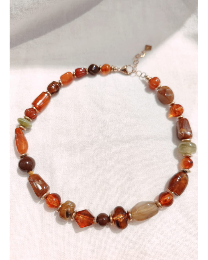 Chaque perle de ce collier est travaillée dans des nuances profondes et chaleureuses, relevées par de fines touches dorées qui ajoutent de l’élégance. Son fermoir pratique avec chaînette réglable permet un ajustement facile à la longueur souhaitée.