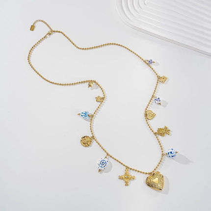 Ce collier se distingue par ses multiples pendentifs délicats : cœurs dorés, perles, symboles et détails inspirés de l’univers bohème. Chaque élément apporte une touche unique et donne du caractère à ce bijou.