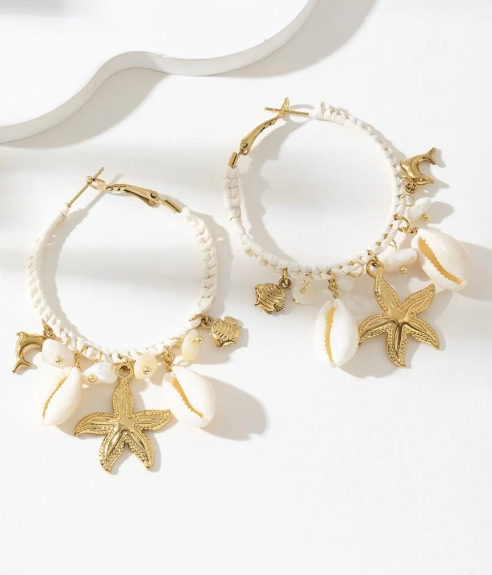 Ces boucles d’oreilles créoles dorées sont un concentré d’été : ornées de coquillages blancs naturels, de breloques dorées en forme d’étoile de mer, dauphin et coquillage, elles reposent sur une base tressée blanche au rendu texturé et artisanal. L’ensemble offre un style bohème chic, parfait pour les beaux jours.