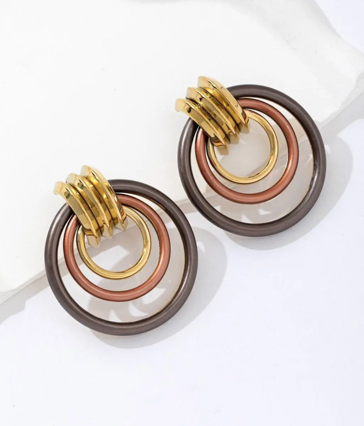 Ces boucles d’oreilles multicercles associent harmonieusement cuivre, doré et brun foncé pour créer un bijou résolument moderne, aux lignes graphiques et structurées. L’assemblage d’anneaux de tailles et couleurs différentes crée une impression de mouvement et de rythme, tout en restant facile à associer.