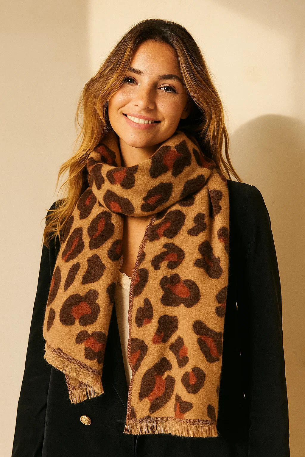Cette écharpe imprimé léopard est l’accessoire parfait pour sublimer une tenue d’hiver. Avec son mélange de 70 % polyester et 30 % coton, elle offre un toucher doux et une chaleur agréable tout en restant légère et facile à porter. Son motif léopard dans des tons camel, marron et noir ajoute une touche de caractère et de modernité à tous les looks.