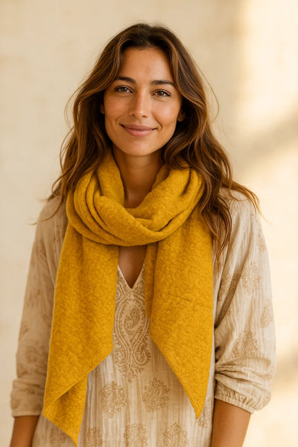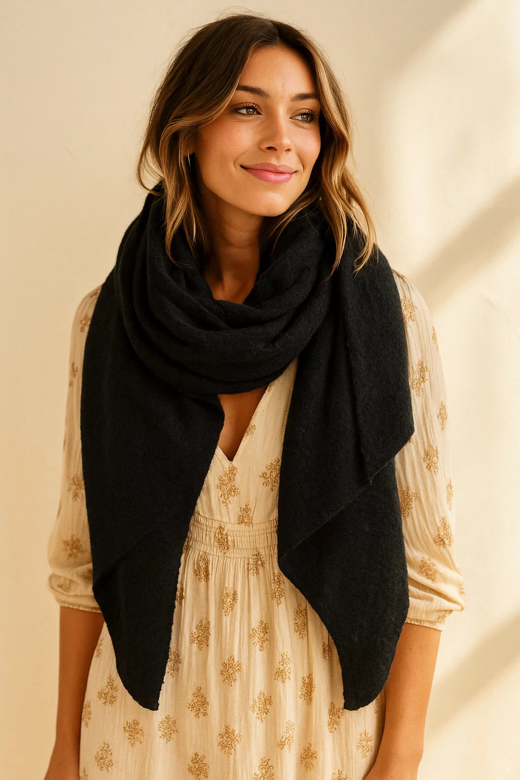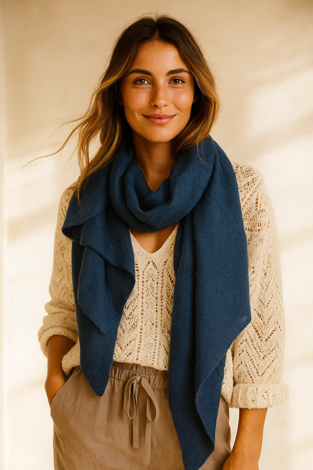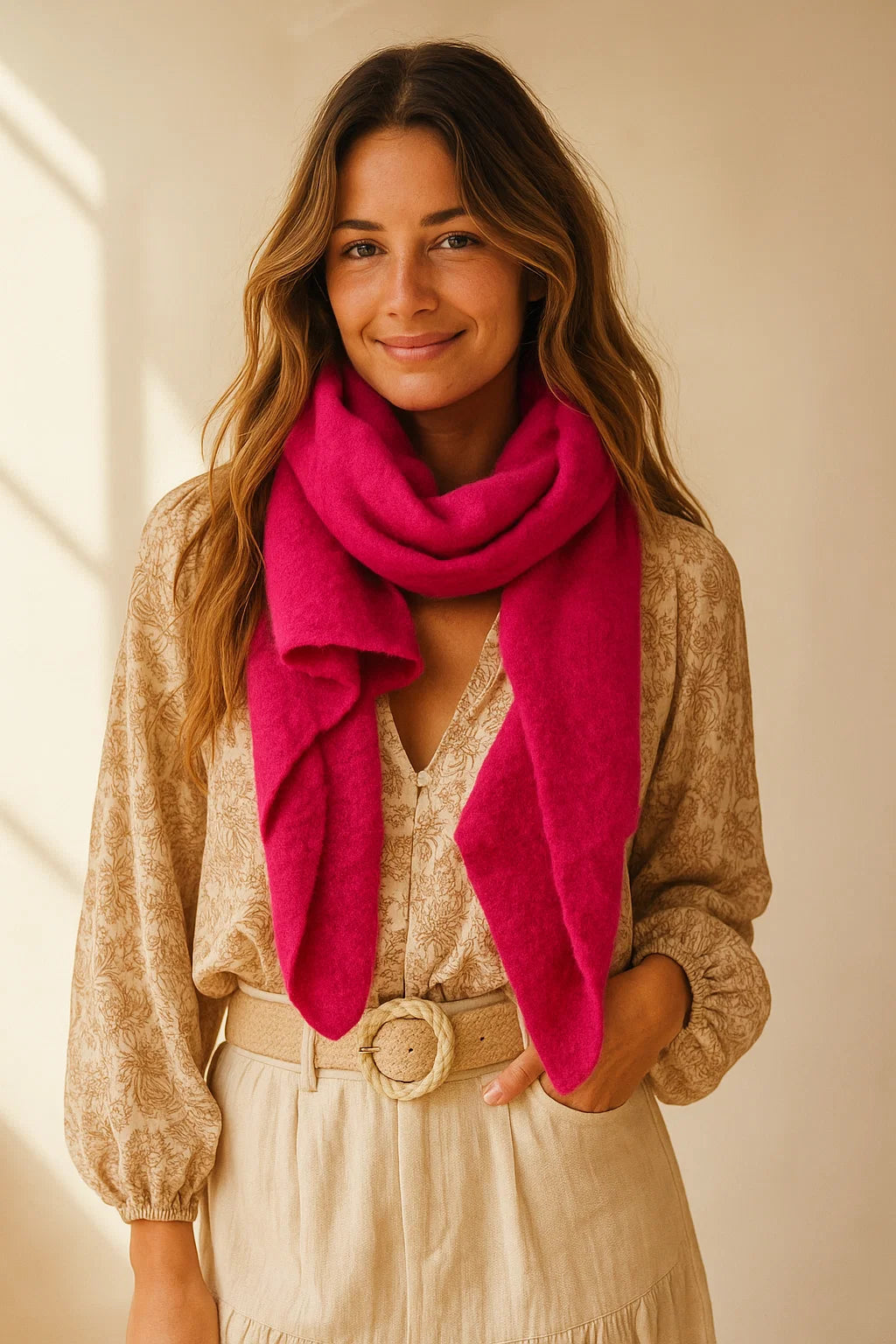 Grâce à sa grande longueur, elle peut être portée de multiples façons : enroulée autour du cou pour un style cosy, ou drapée sur les épaules pour une allure plus chic. Disponible en plusieurs coloris doux et intemporels, cette écharpe s’accorde aisément avec un manteau long, un gilet mohair ou un pull oversize.