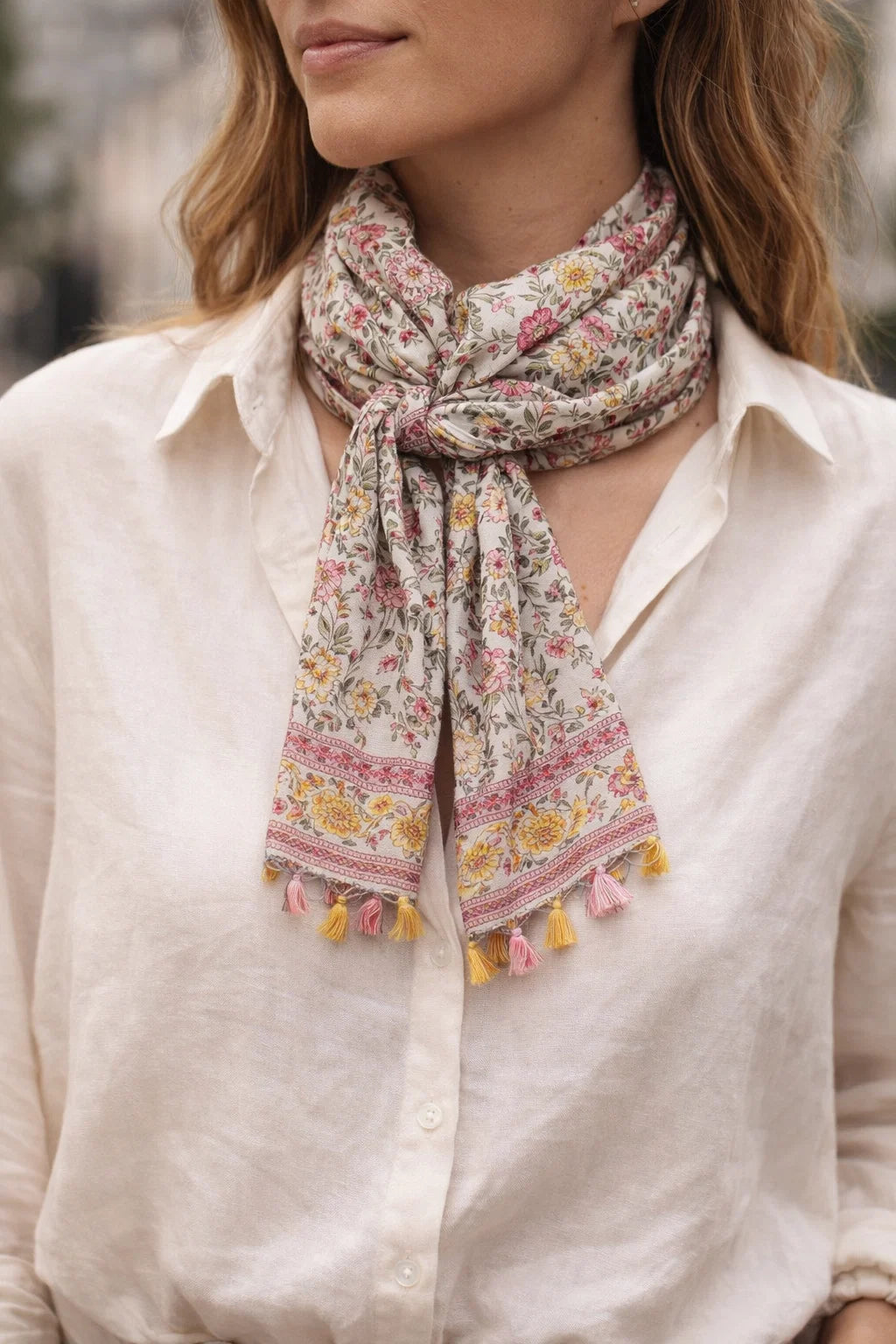 Un grand foulard bohème, doux et délicatement fleuri