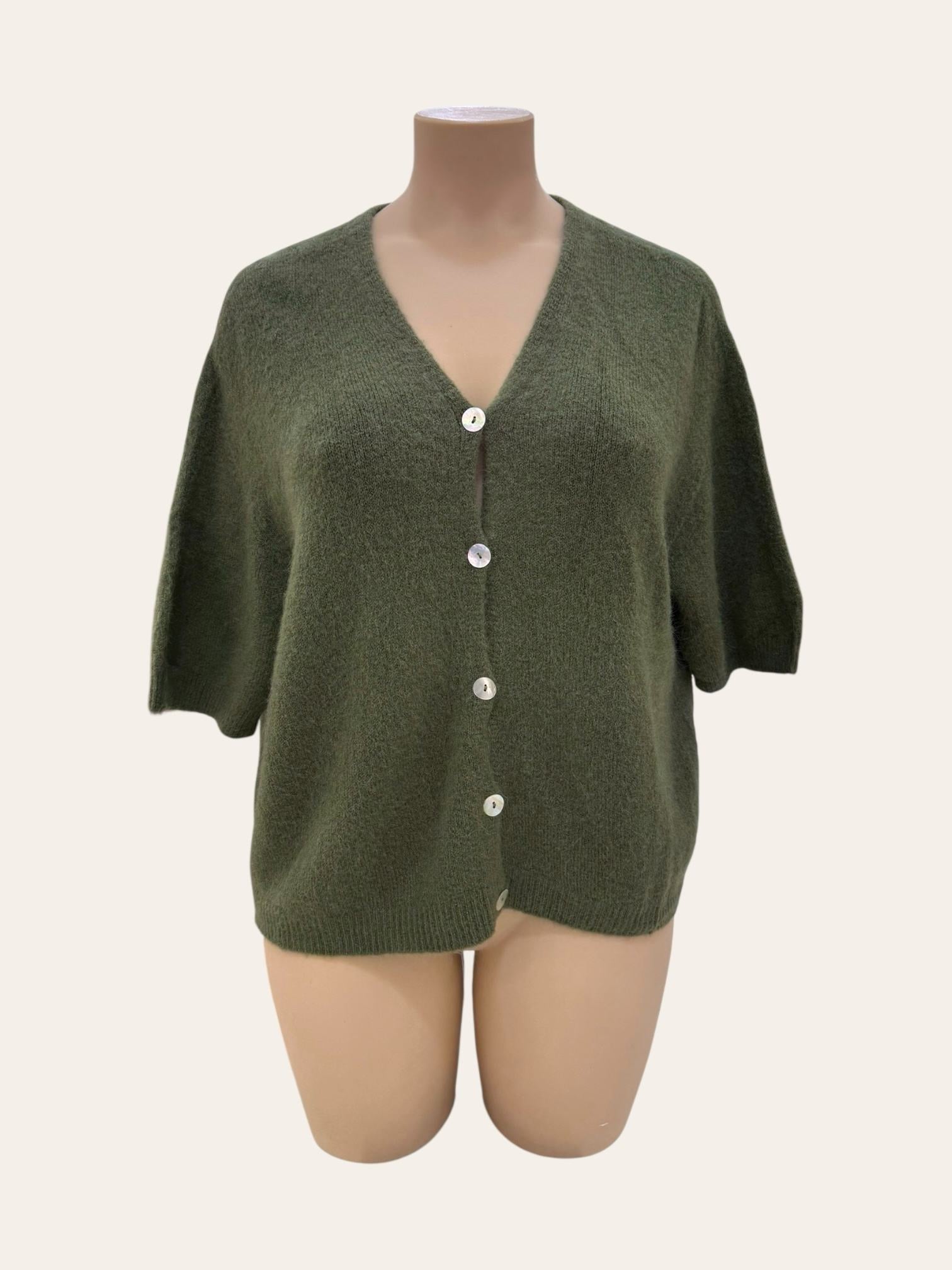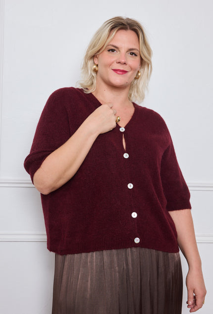 Ses manches courtes en font une pièce idéale pour la mi-saison ou les journées d’été un peu fraîches. Sa fermeture boutonnée avec de jolis boutons nacrés apporte une touche raffinée, tandis que ses coloris élégants – bordeaux profond et vert olive – permettent de varier les styles.