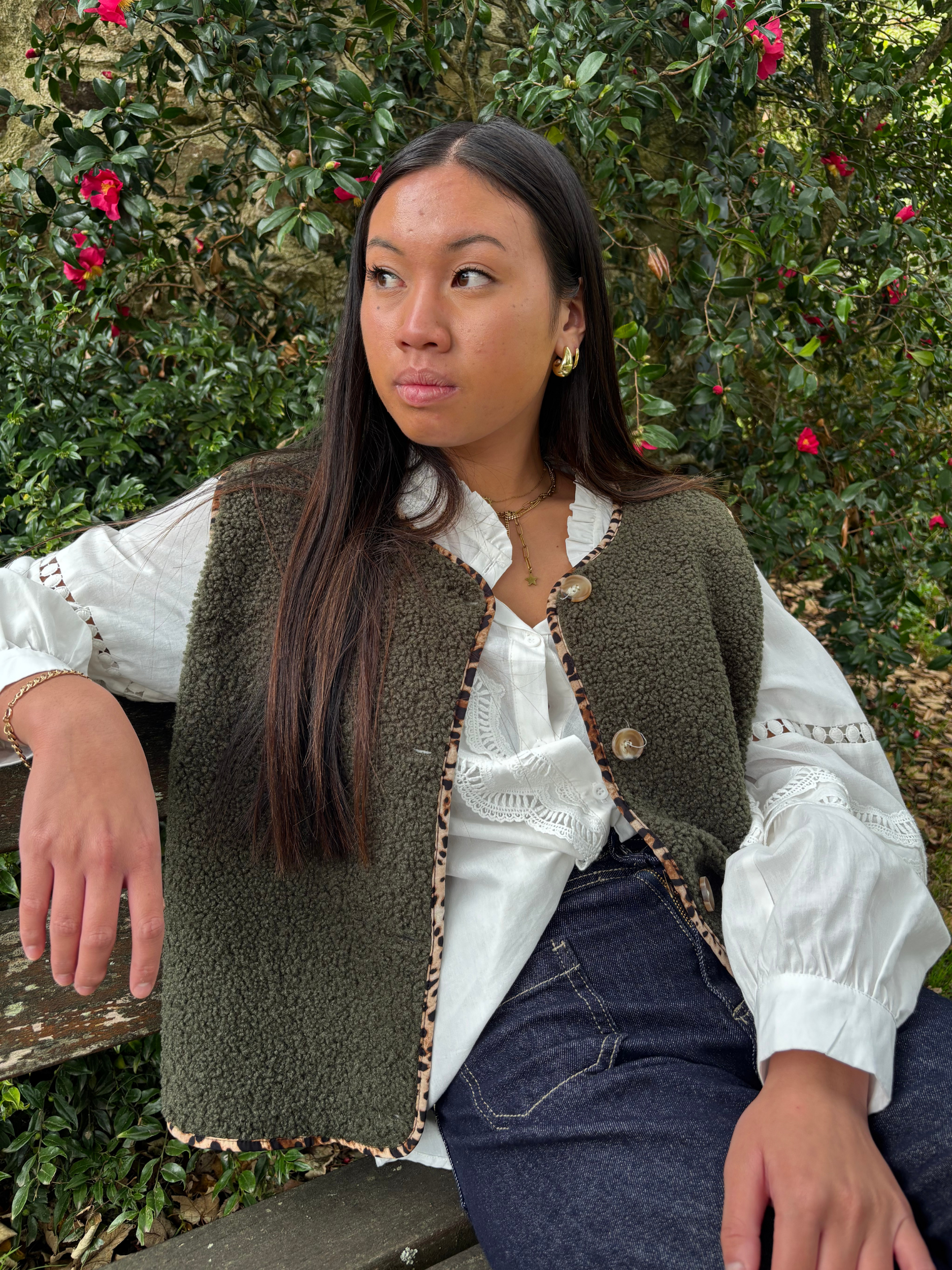 Confectionné dans un tissu imitation laine bouclée, ce gilet se distingue par ses finitions imprimé léopard qui apportent une touche bohème et audacieuse. Fermé par de jolis boutons, il s’enfile facilement sur une chemise, un tee-shirt ou un pull fin, pour un look à la fois pratique et tendance.