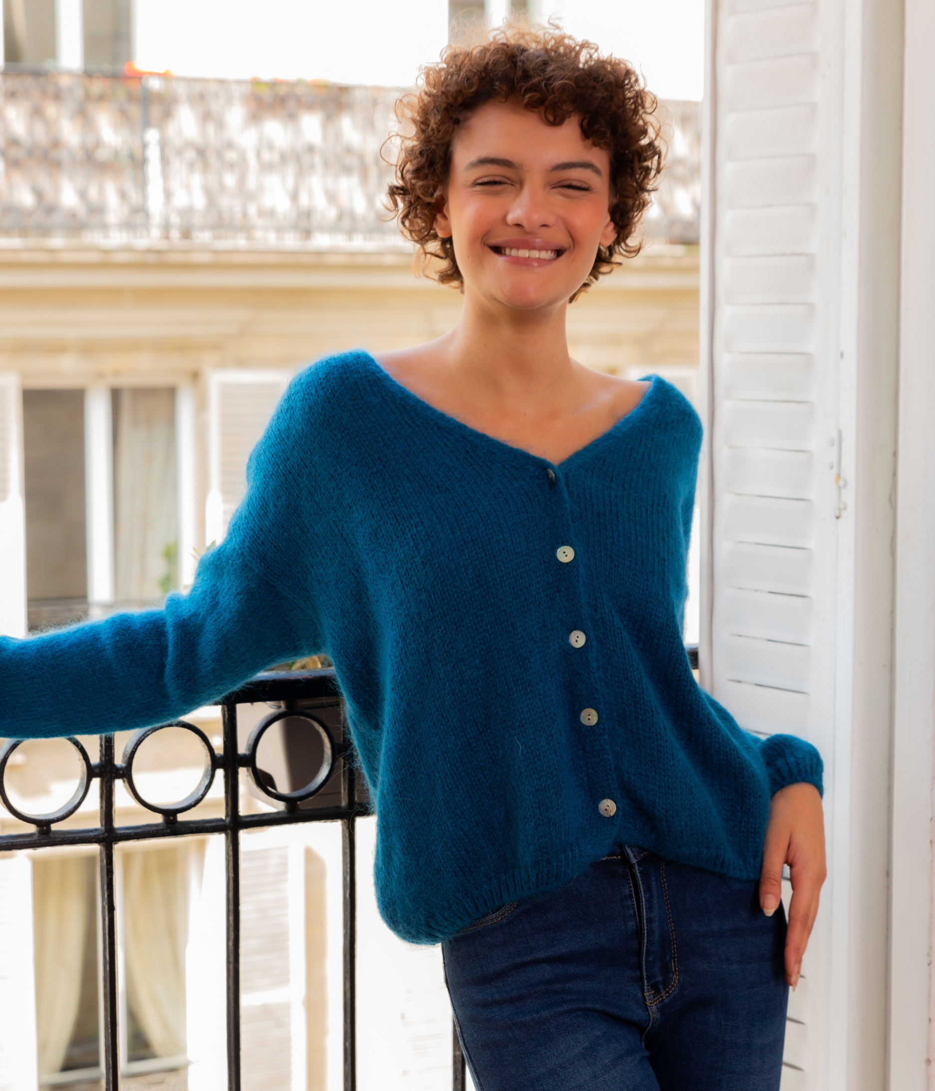 Ce gilet en maille douce est un incontournable de la saison. Avec sa composition mohair (30 %), il offre chaleur et légèreté, sans jamais alourdir la silhouette. Sa coupe ample, ses manches longues et son encolure en V mettent en valeur toutes les morphologies, du 36 au 44.