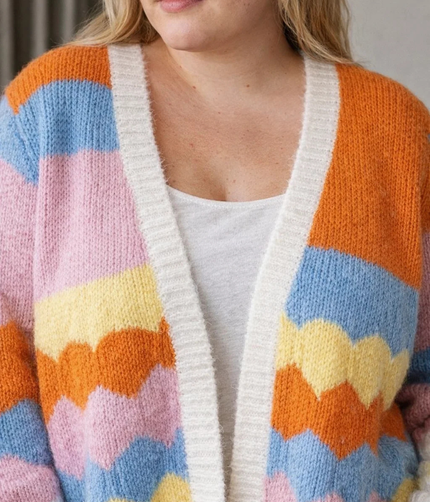 Ce gilet taille unique du 42 au 48 est une véritable pièce forte. Sa maille moelleuse et ses rayures ondulées multicolores apportent une touche joyeuse et moderne à votre dressing.